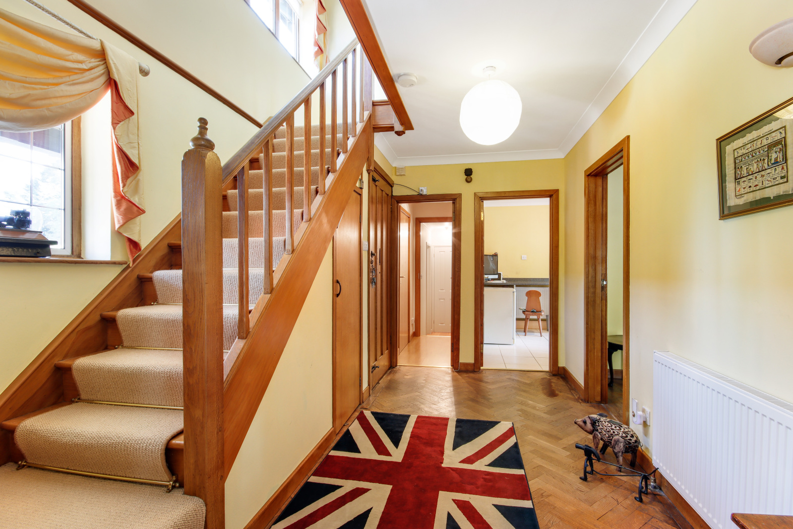 Entrance Hall Period door to front. Herringbone flooring. Carpet. Plain ceiling. Radiator. Stairs leading to landing with understairs cupboard.