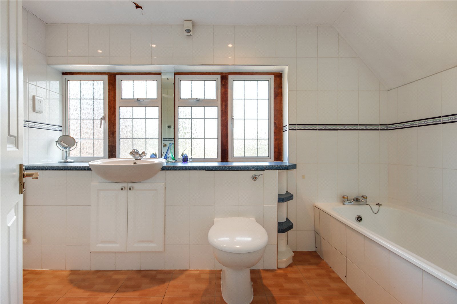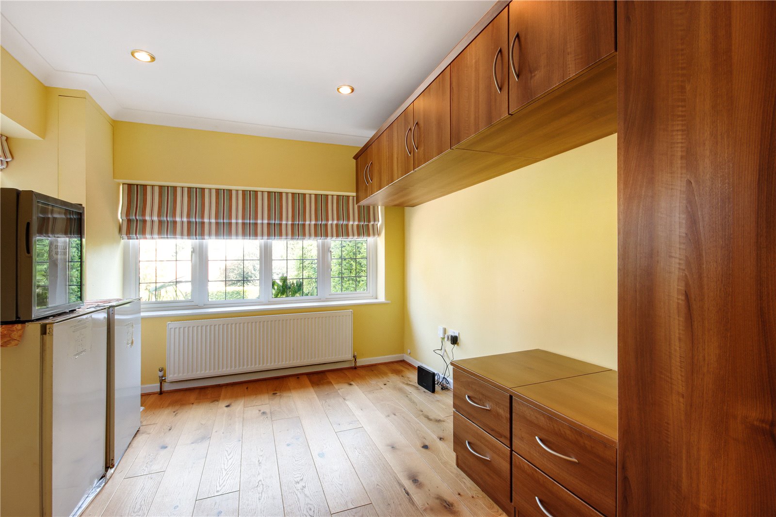 Study/Bedroom 15'7" x 9'3" (4.75m x 2.82m). Double glazed leaded light effect windows to front and side. Wood effect flooring. Plain coved ceiling with downlights. Radiator. Built-in wardrobes. Access to loft.