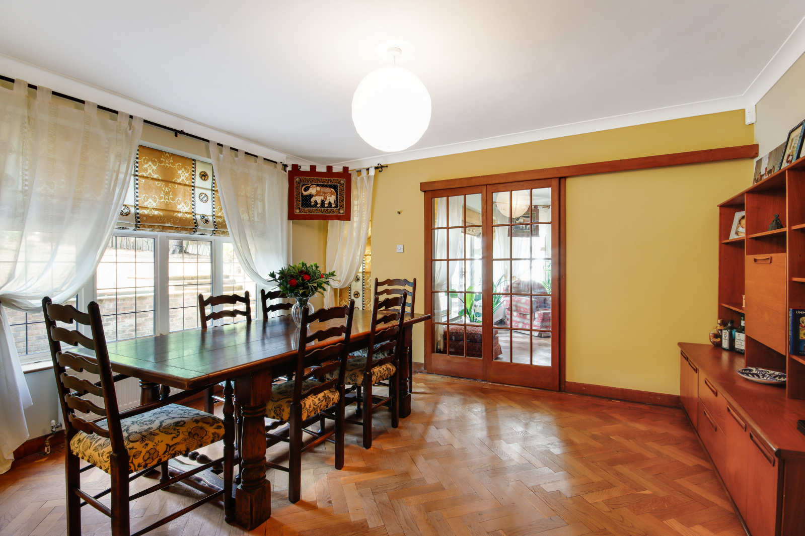 Dining Room 13'11" x 13'5" (4.24m x 4.1m). Double glazed window to rear. Double glazed leaded light effect window to side. Two sliding glass panelled doors leading to the sitting room. Herringbone flooring. Plain coved ceiling. Radiator.