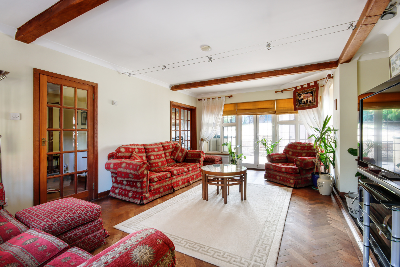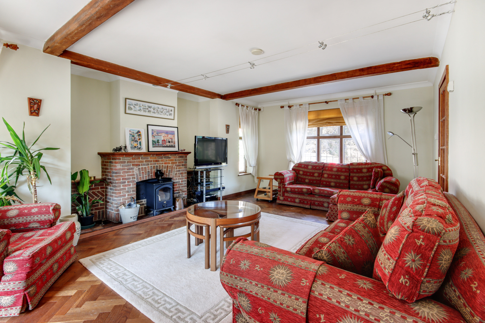 Sitting Room 19'11" x 14'11" (6.07m x 4.55m). Double glazed leaded light window to front. Two double glazed leaded light effect windows to side. Double glazed leaded light effect French doors to rear. Double glazed leaded light effect windows to rear. Herringbone wood flooring. Beamed ceiling. Three radiators. Brick built fireplace. Wood burning stove.