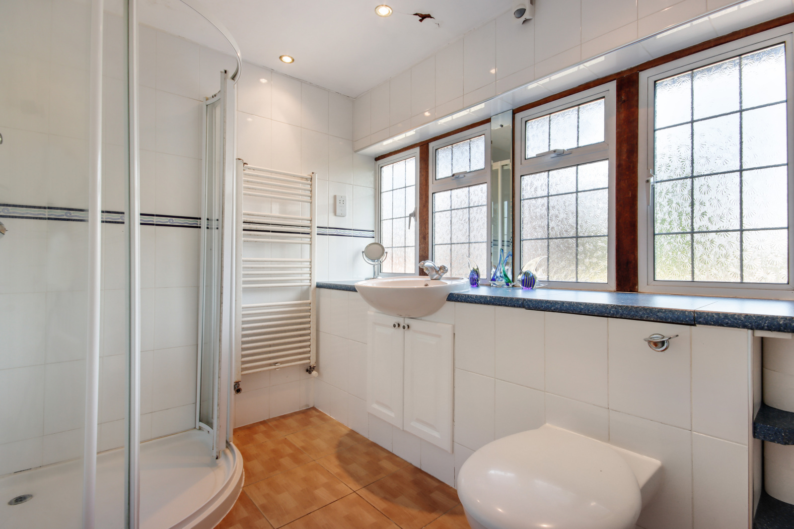 Bathroom 10'8" x 5'11" (3.25m x 1.8m). Double glazed frosted leaded light effect window to front. Tiled flooring. Plain ceiling with downlights. Heated towel rail. Panelled bath. Wash hand basin in vanity unit. Low level WC. Shower cubicle. Shaver point. Radiator. Wall heater. Extractor fan.