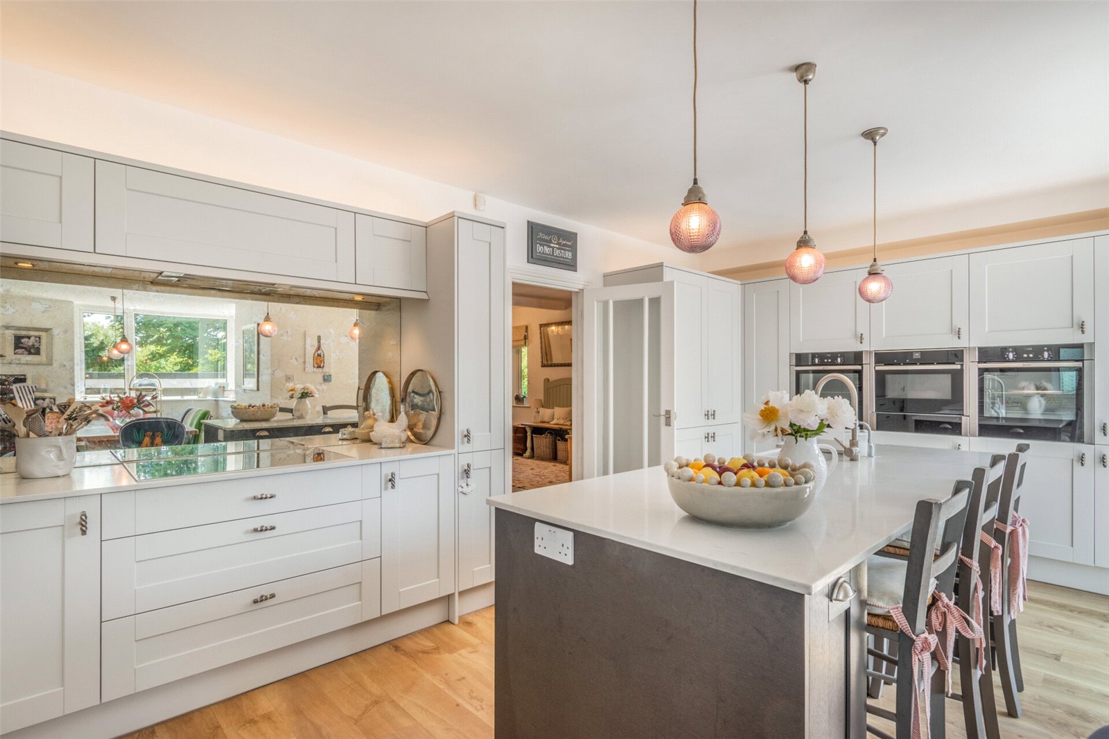 Kitchen/Diner 18'8" (5.7m) x 11'4" (3.45m) and 8'8" (2.64m) x 7'9" (2.36m). Double glazed windows to rear and side. Double glazed French doors to rear. Double glazed door to side leading to boot room. Amtico flooring with underfloor heating. Plain ceiling. Fitted wall and base units with work tops over, island and breakfast bar. Two Neff ovens, Neff microwave plus warming draw. Lamona wine fridge/freezer and full height Lamona fridge/freezer. AEG dishwasher. Neff hob with extractor over. Double Butler style sink with mixer tap and filter water tap. Cover housing gas and electric meters. Quooka hot tap.