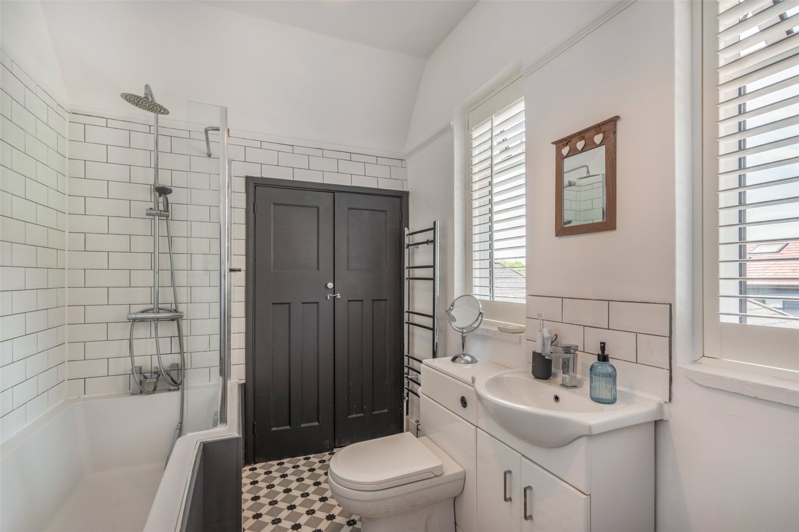 Bathroom 10'3" x 6'9" (3.12m x 2.06m). Two double glazed windows to side. Tiled flooring. Plain ceiling. Panelled bath with shower attachment. Wash hand basin with mixer tap and vanity unit. Low level W.C. Storage cupboard, housing boiler and Tempest water cylinder.