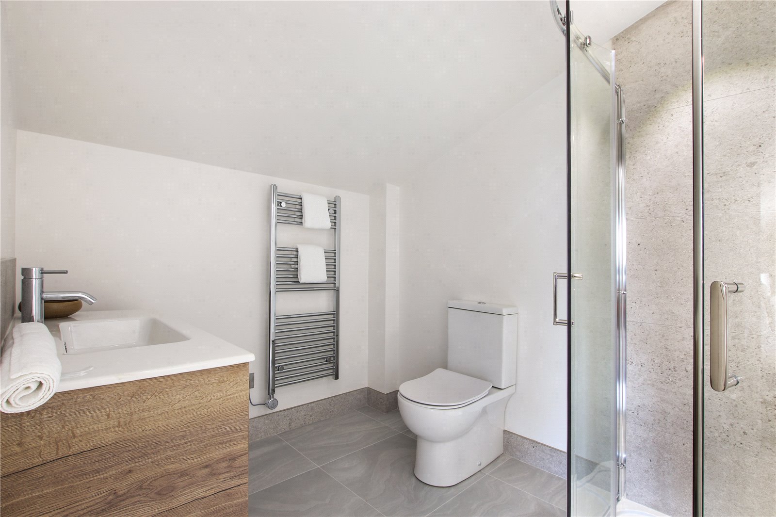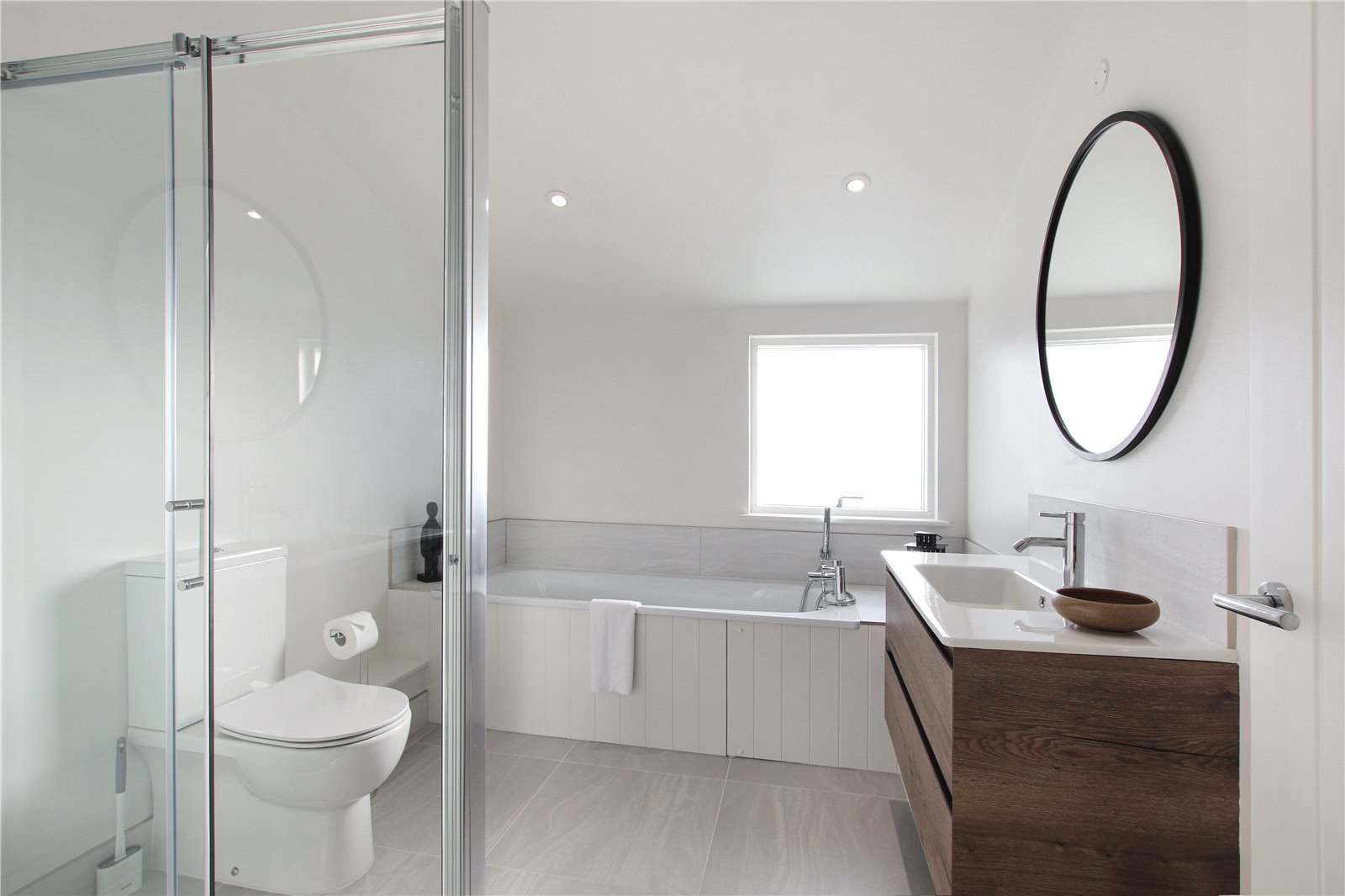 Family Bathroom 9'8" x 7'10" (2.95m x 2.4m). Double glazed frosted window to side. Tiled flooring. Underfloor heating. Plain ceiling. Downlights. Extractor fan. Heated towel rail. Four-piece suite comprising panelled bath with mixer taps and shower attachment, low level wc, floating wash hand basin and double drawer vanity unit and mixer taps. Walk-in shower with Saneux overhead shower and handheld attachment. Shaver point.