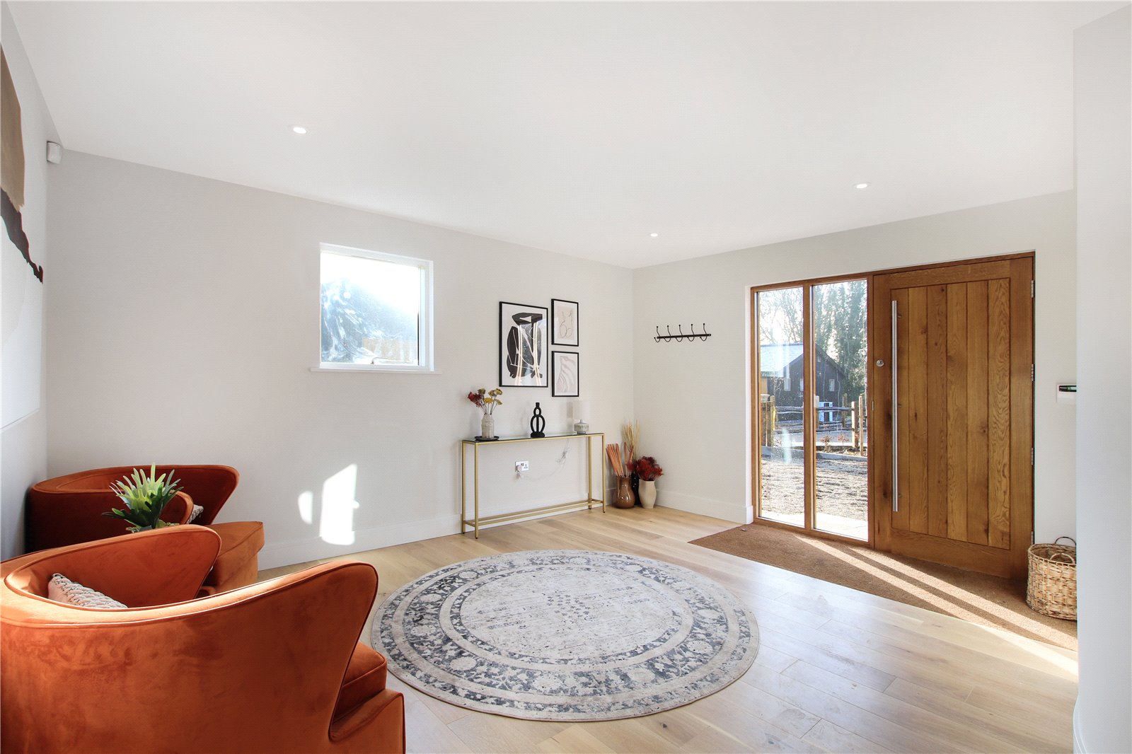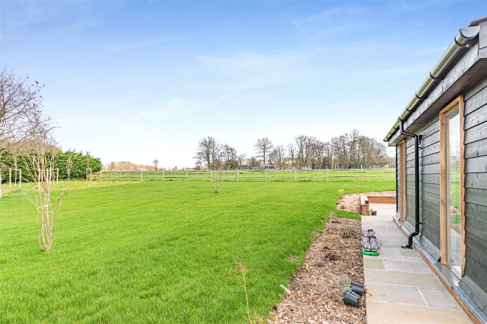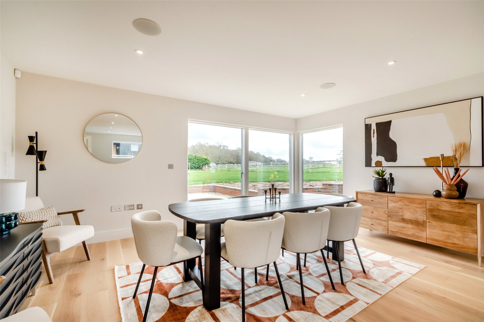 This five bedroom new build detached barn style home, is a Well-being considered design and is situated in a semi-rural area, at Cottage Farm. It is dressed in stained timber cladding, with powder coated aluminium and pine Velfac windows plus natural Spanish slate roof. This stunning property within this boutique development is the largest of four newly built family homes. Set in a quiet rural setting and nestled in the Kent countryside within the area known as Otford Hills in the Sevenoaks District. The property has been built to a high standard throughout with a specification for modern day living yet great care has been taken to ensure this home blends into its rural setting. The property comes with ample parking and an attached garage and a car charging point. Many features to note include a designer kitchen by Wren with silkstone Sardinian white quartz worksurfaces and integrated appliances. The modern and contemporary sanitary ware is by Saneux. The flooring is Barlinek engineered timber, with carpets in all bedrooms and tiling to the bathrooms and ensuites. The property has solar panels and the heating is via an air source heat pump with underfloor heating. Wiring for fibre optic broadband (purchaser to instruct supplier). The property has 5 amp sockets with mood scene lighting. The wrap around garden has a sandstone paved patio which leads to the lawn areas and the rear post and rail fencing giving the benefit of a relaxing views across the neighbouring paddocks. This impressive family home comes with vacant possession and also with a Warranty provided by Buildzone.