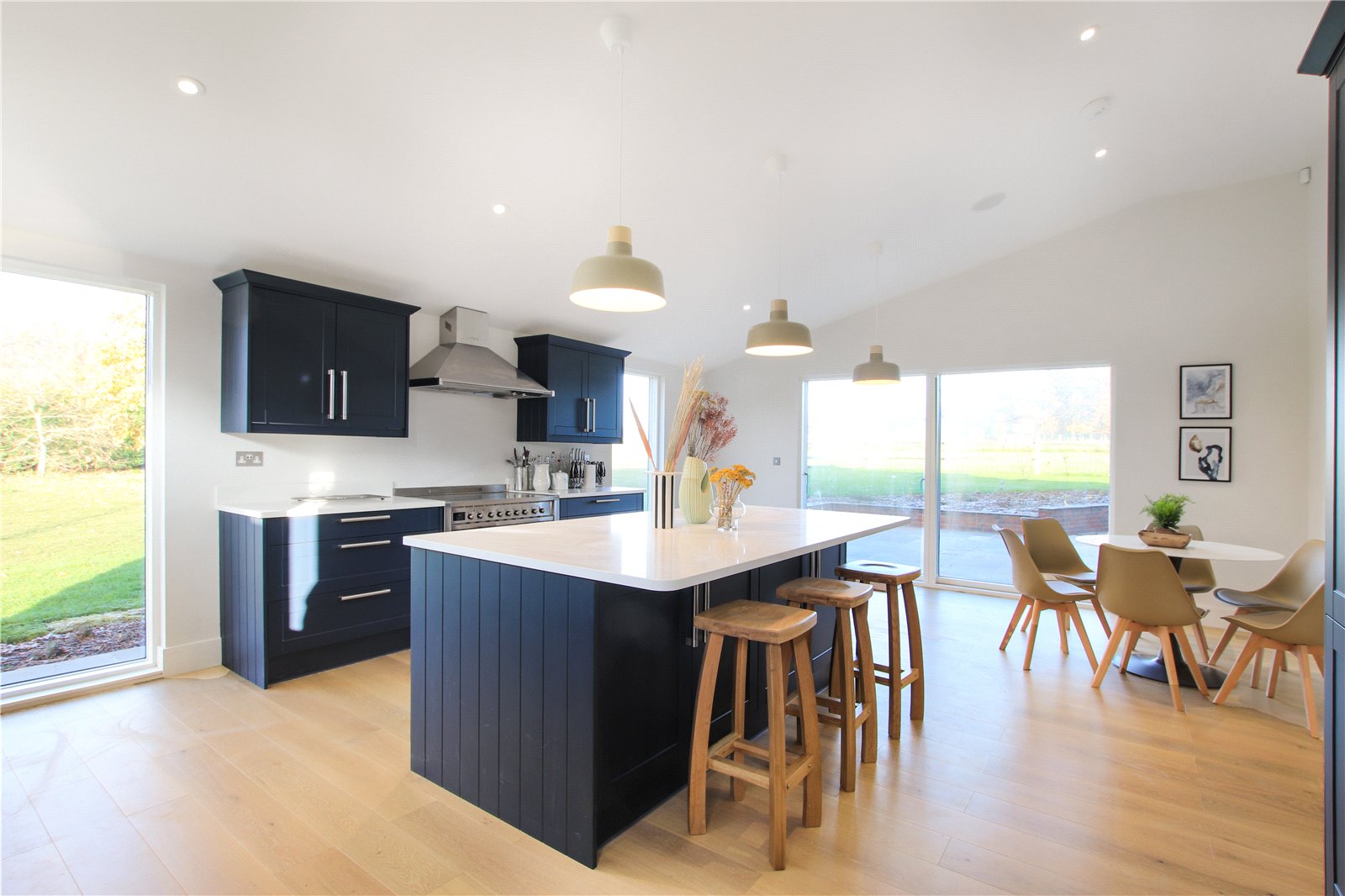 Kitchen/Dining Room 22'9" x 17'3" (6.93m x 5.26m). Two double glazed windows to front. Two double glazed glass doors to side. Double glazed patio sliding doors to rear. Engineered wood flooring. Underfloor heating. Plain ceiling. Downlights. Smoke alarm. Ceiling speakers. Fitted Wren Shaker Navy Matt tall, wall and base units and Silkstone Sardinian White Quartz work surfaces. Integrated AEG dishwasher. Smeg stainless steel electric range with Smeg stainless steel filter hood. Zanussi oven. Double Smeg stainless steel sinks with hot mixer water tap. Integrated CDA wine cooler. Freestanding Samsung fridge/freezer.