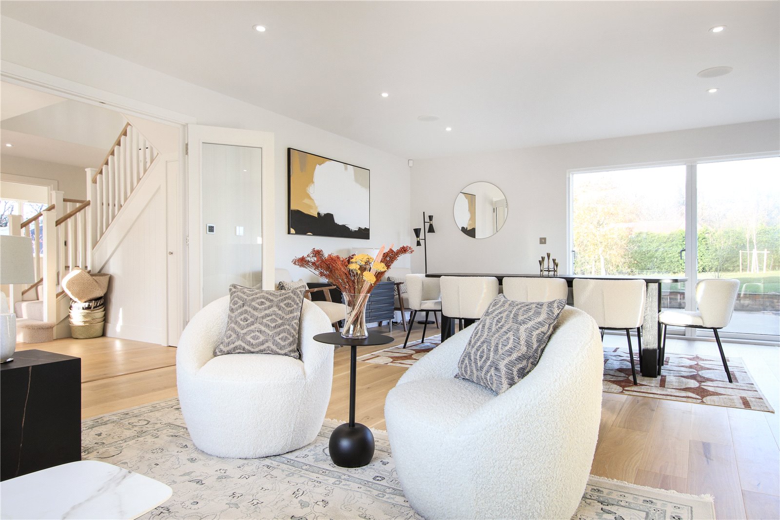 Sitting Room 28'4" x 17' (8.64m x 5.18m). Double glazed patio sliding doors to side. Full length double glazed window to rear. Double glazed window to rear. Engineered wood flooring. Underfloor heating. Plain ceiling. Downlights. Smoke alarm. Ceiling speakers. Glass double doors to hall.