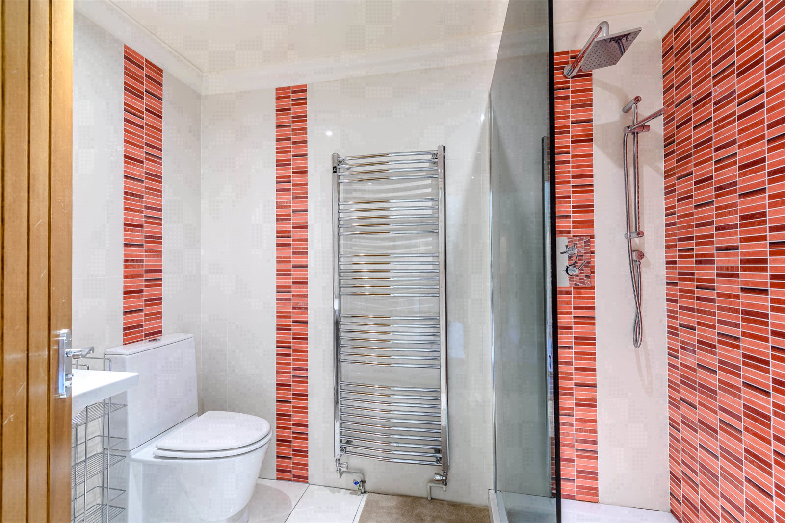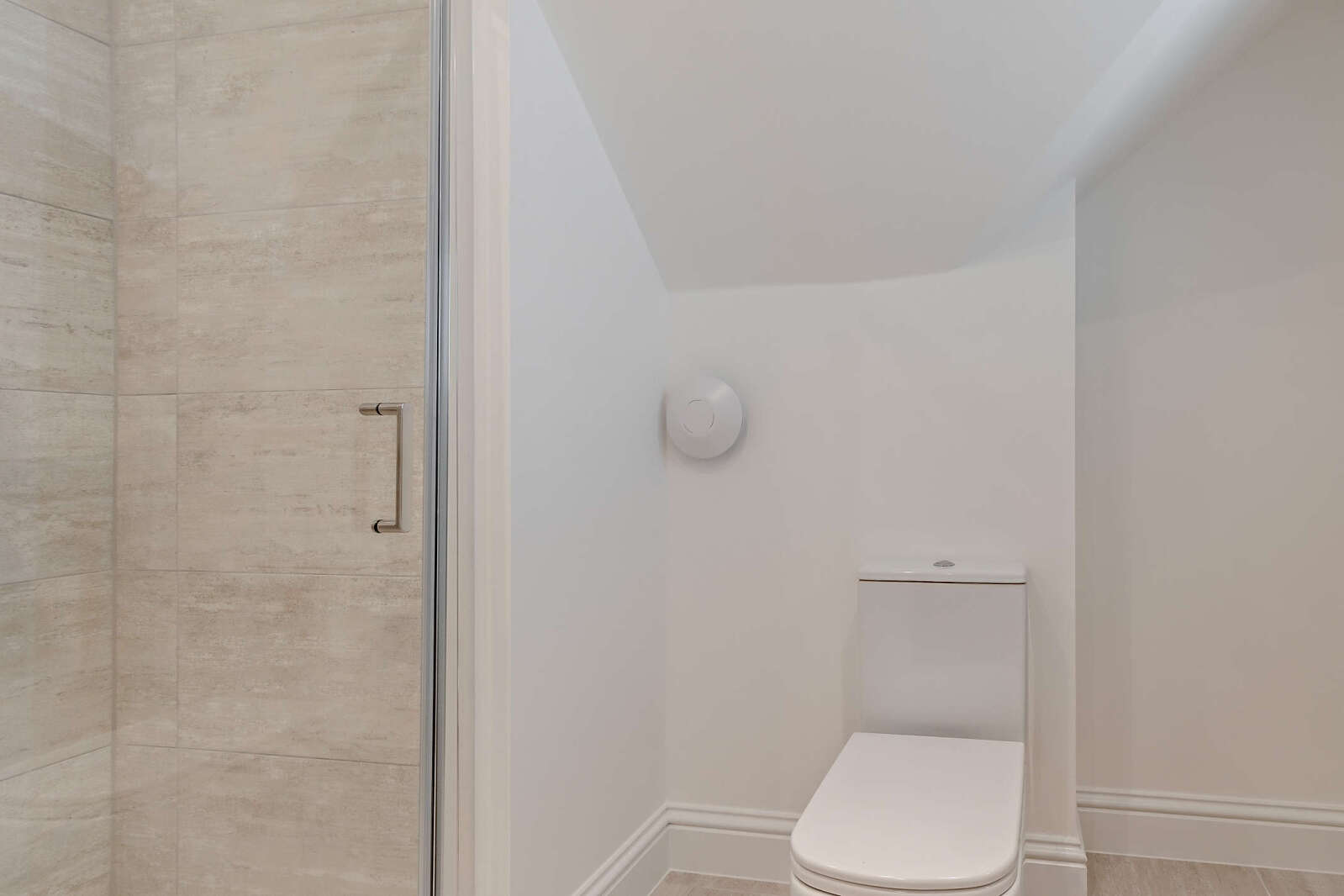 En-suite 8' x 5' (2.44m x 1.52m). Double shower with overhead and handheld shower, pedestal wash hand basin with mixer tap. Close coupled WC. Heated towel rail. Coved ceiling. Downlights. Extractor fan. Fully tiled.