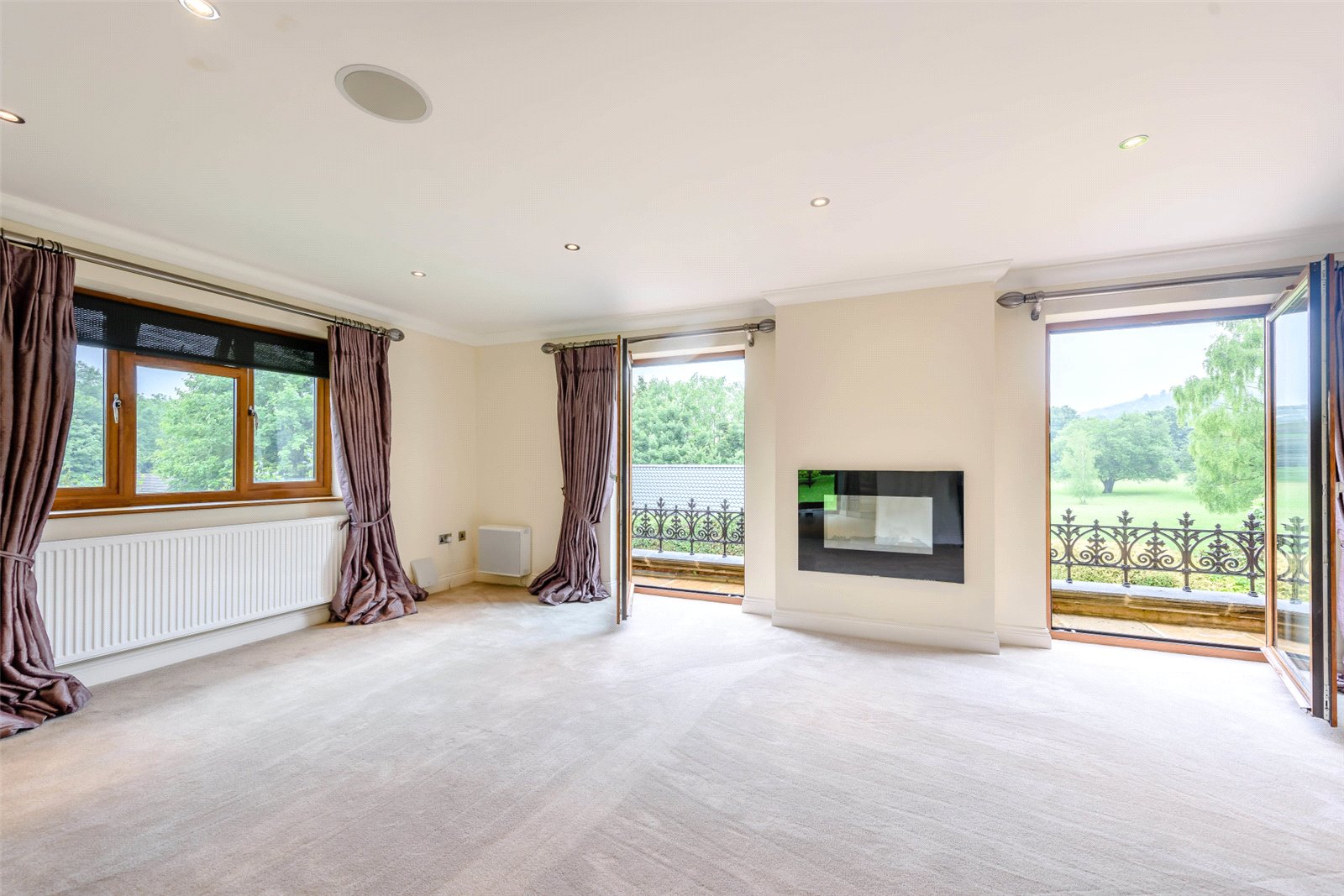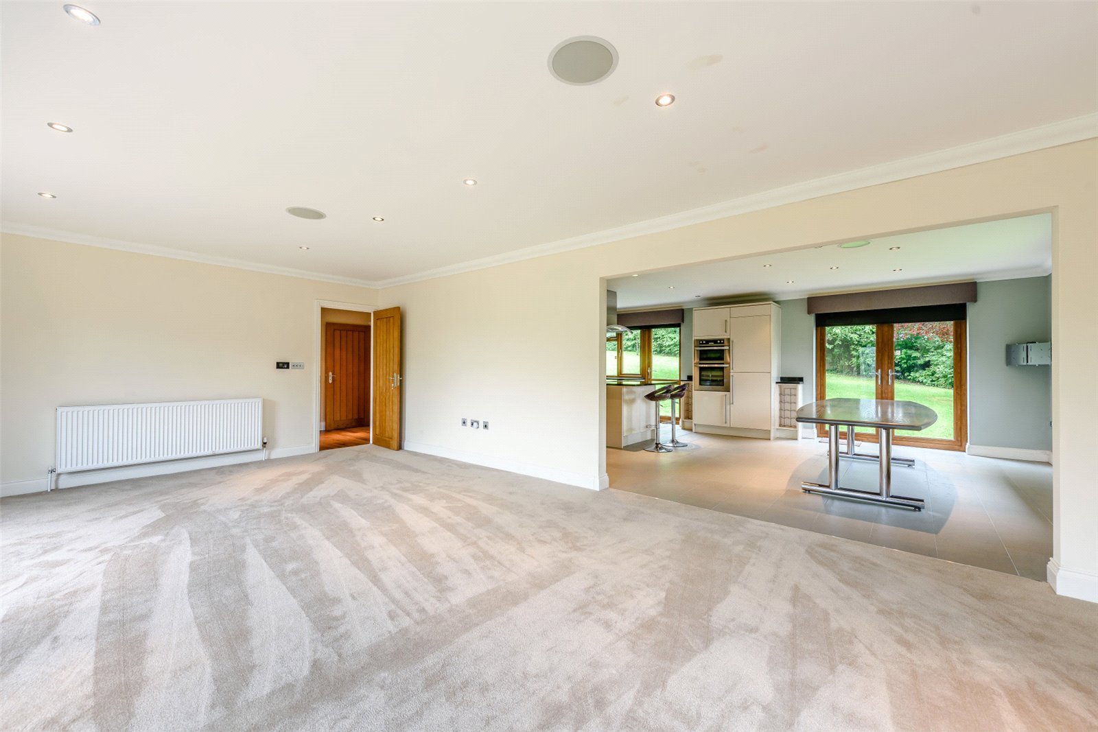 Reception Room 24'3" x 15'10" (7.4m x 4.83m). Double glazed window to side. Double glazed French doors opening out to a decorative wrought iron and flagstone terrace allowing sweeping views across the surrounding countryside. Open plan to the Dining Room. Coved ceiling. Downlights. Carpet. Two radiators. Wall mounted Living Flame fire.
