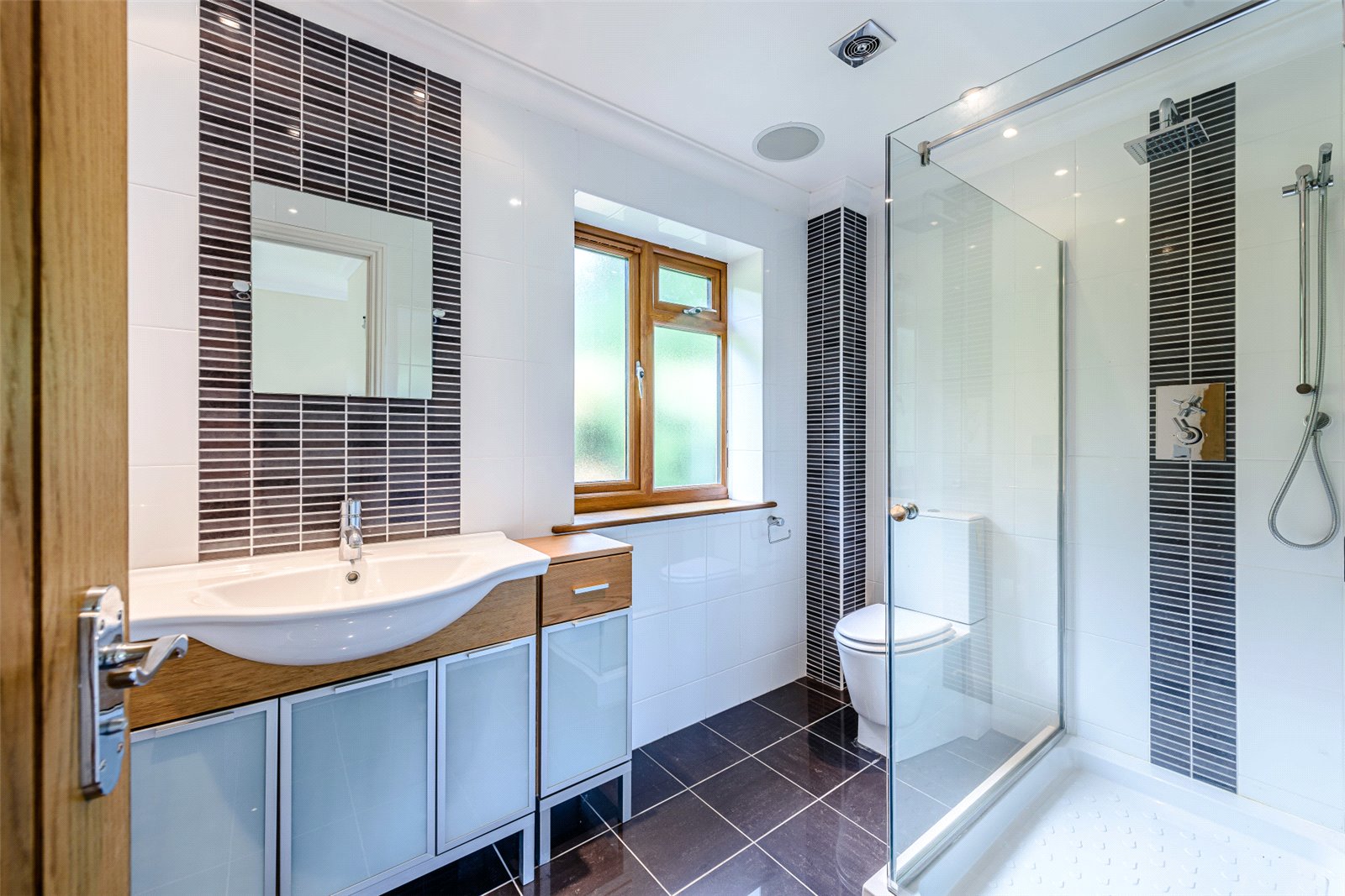 En-suite 8'8" x 5'8" (2.64m x 1.73m). Double glazed frosted window to rear. Double shower with overhead and handheld shower, wash hand basin in vanity unit with mixer tap. Close coupled WC. Tall radiator Coved ceiling. Downlights. Extractor fan. Fully tiled.