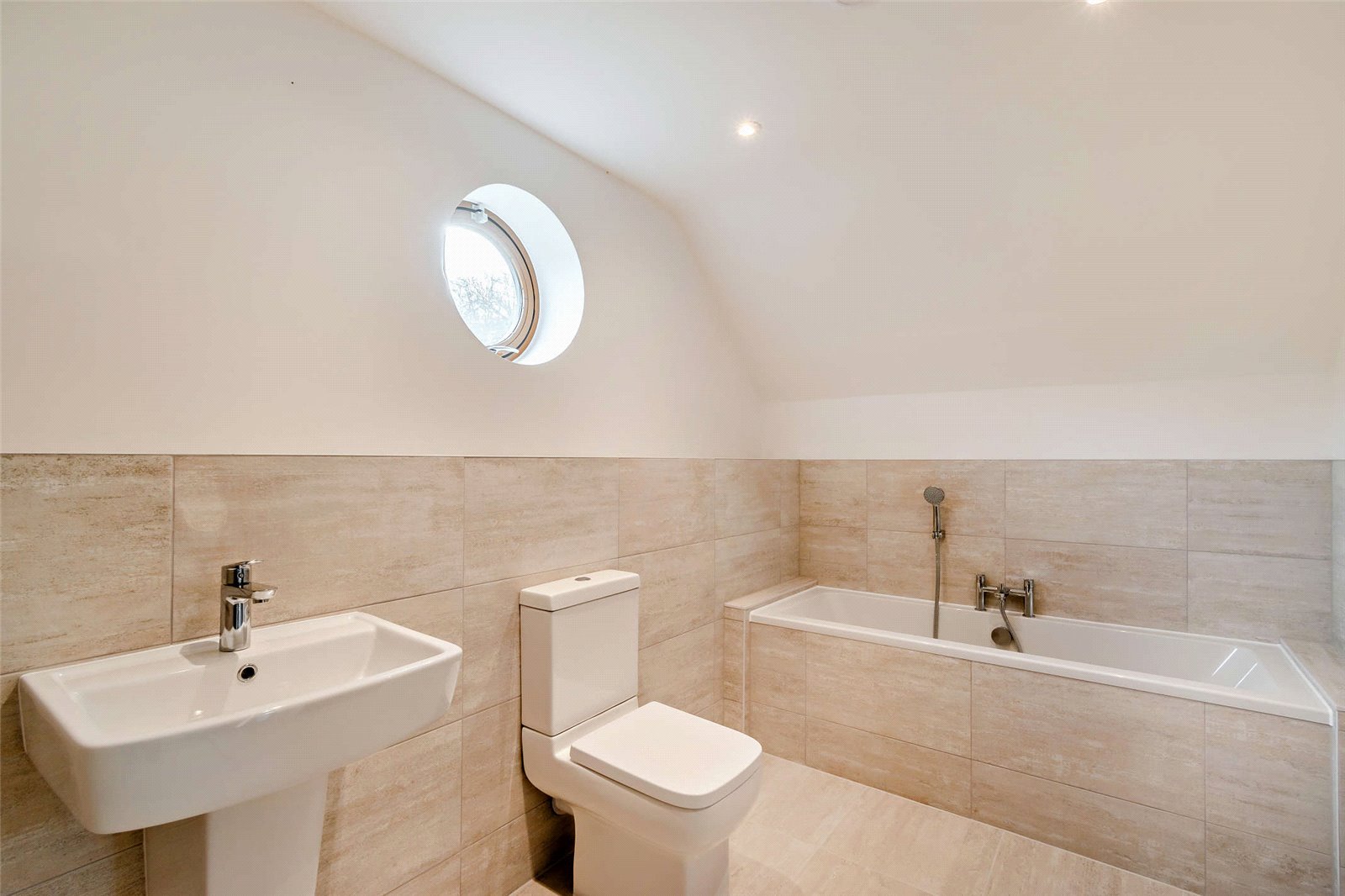 En-suite 11'9" x 7' (3.58m x 2.13m). Double glazed circular window. Bath with hot & cold tap and shower, close coupled WC. Tiled flooring. Heated towel rail. Plain ceiling. Downlights. Extractor fan. Local tiling to walls.
