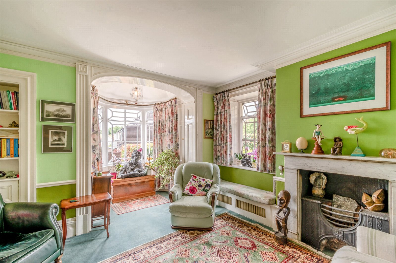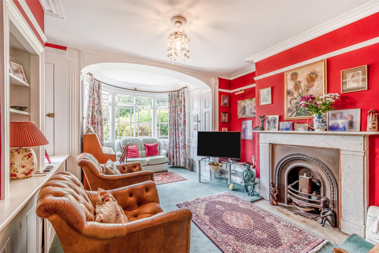 Sitting Room 17'11" x 14'4" (5.46m x 4.37m). Dual aspect window to side & bay window to front and with period wooden panelled shutters. Fitted carpet. Plain coved ceiling. Two radiators with covers. Period storage cupboards and shelving. Period cast iron fireplace, with surround.