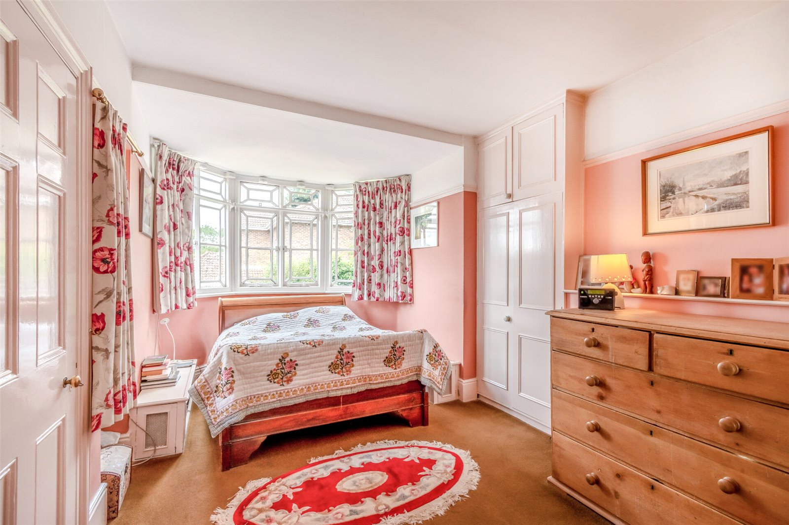 Bedroom 12' x 11'7" (3.66m x 3.53m). Double aspect windows to front and window to side. Fitted carpet. Plain ceiling. Radiator. Storage cupboard. Period overhead storage above the door.
