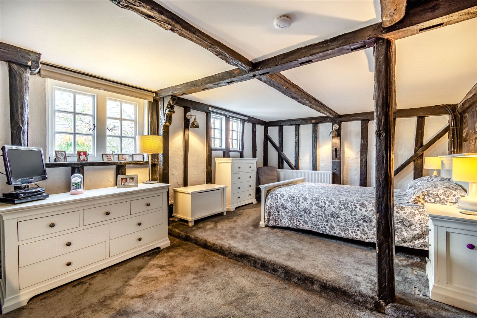 Master Bedroom 20'4" x 12'6" (6.2m x 3.8m). Two glazed windows to side. Carpet. Beamed ceiling and vertical beams. Two radiators. Eaves storage. Wooden panelled wall.