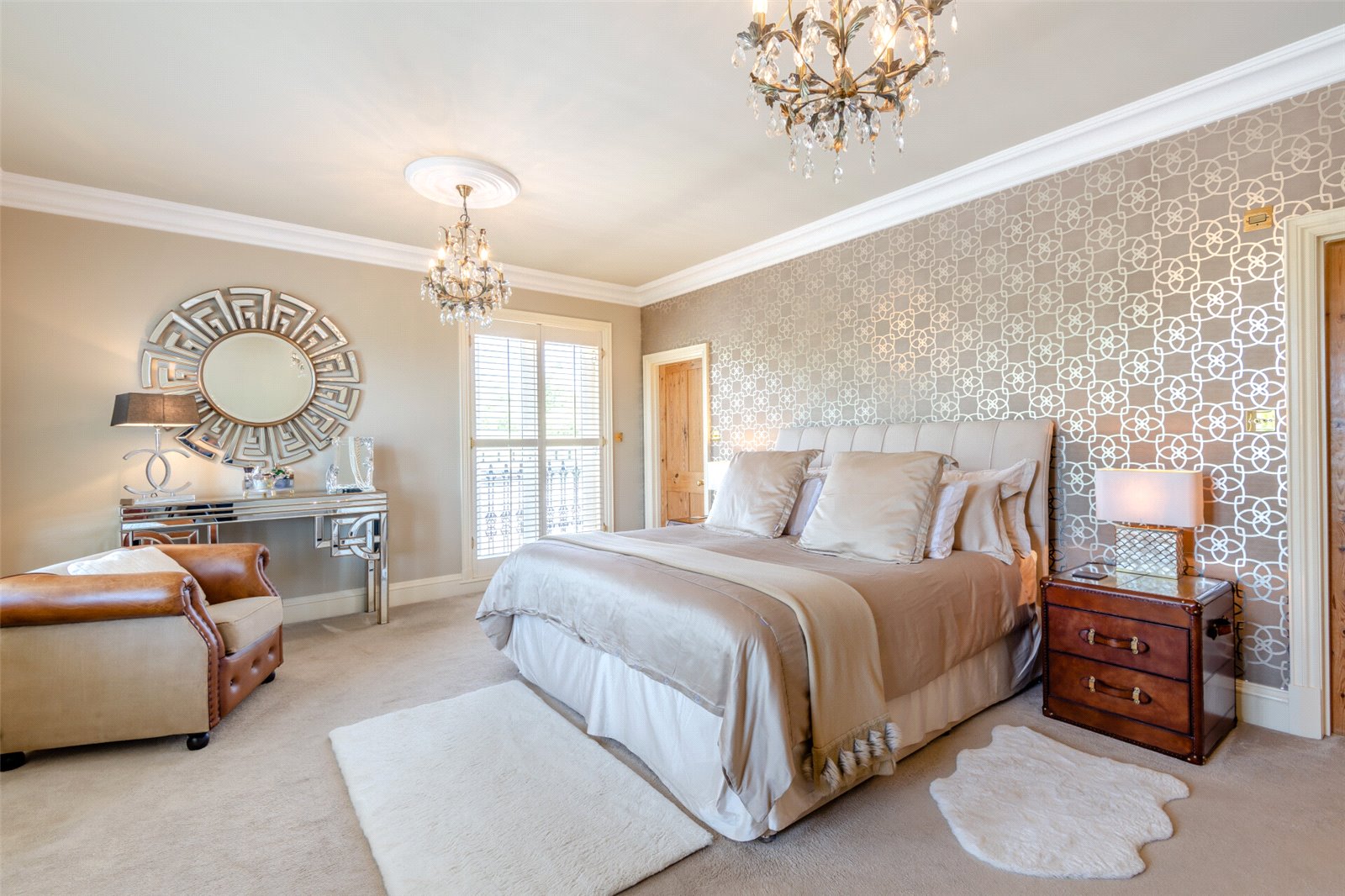 Main Bedroom 22'8" x 14'7" (6.9m x 4.45m). Three double glazed Georgian effect windows to front with shutters. Double glazed French doors to side with Juliet balcony and shutters. Cornice ceiling. Carpet. Radiator.