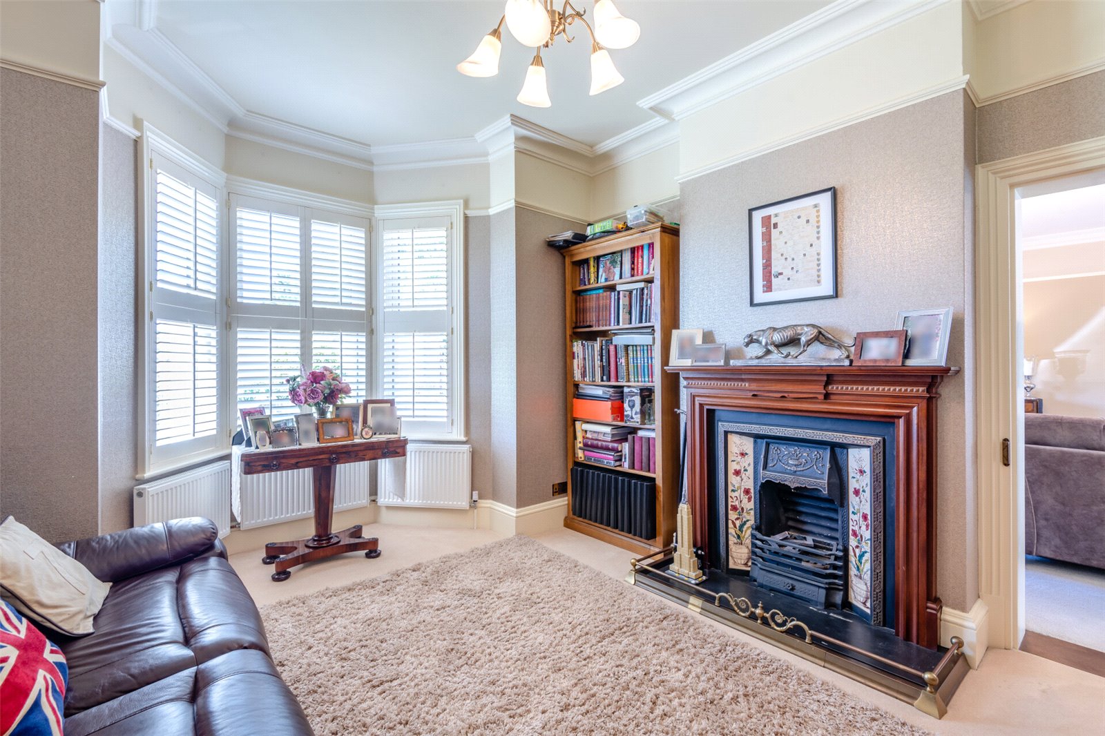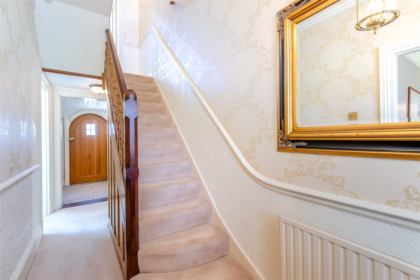 Entrance Hall Wooden door to front with picture window over. Corniced ceiling. Dado rail. Carpet. Understairs storage cupboard. Radiator. Stairs leading to lower landing and first floor.