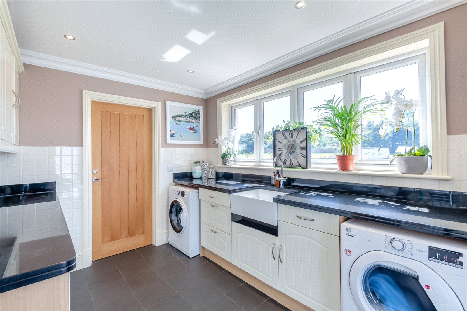 Utility Room 14'6" x 8'6" (4.42m x 2.6m). Double glazed window to side. Plain coved ceiling with downlights. Tiled flooring with underfloor heating. Wall and base units with granite worktops over. Butler sink with mixer tap. Space for washing machine. Space for tumble drier. Local tiling. Cupboards housing water cylinder, water softener & consumer unit. Heated towel rail.