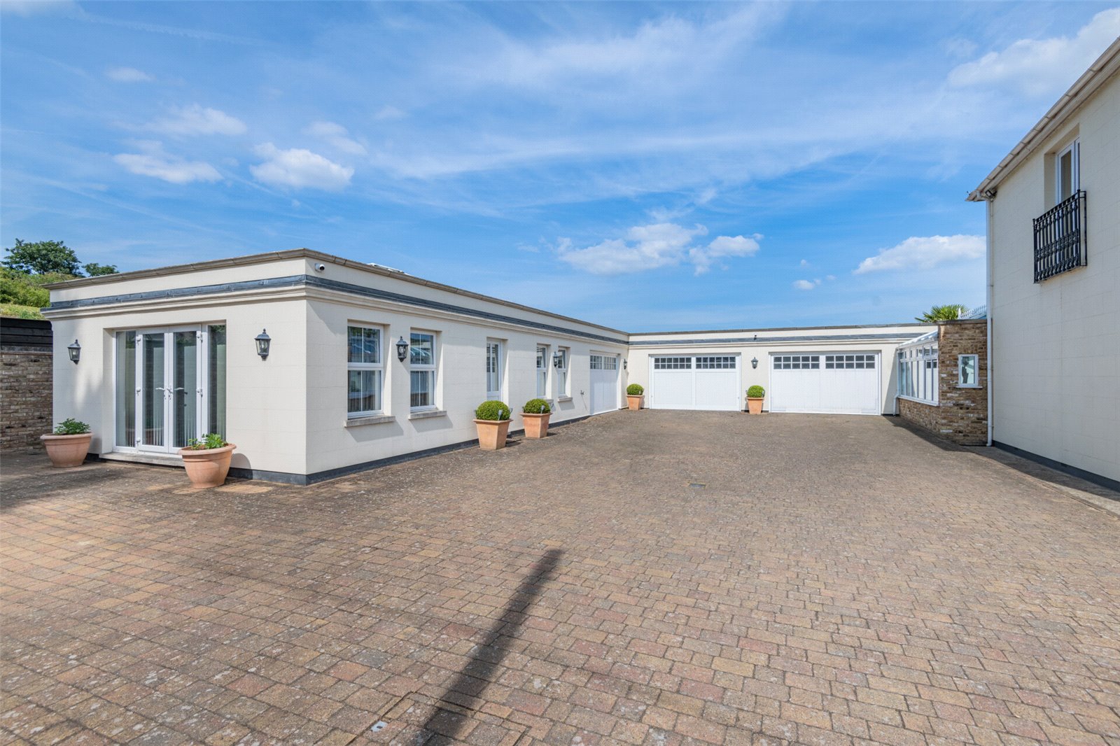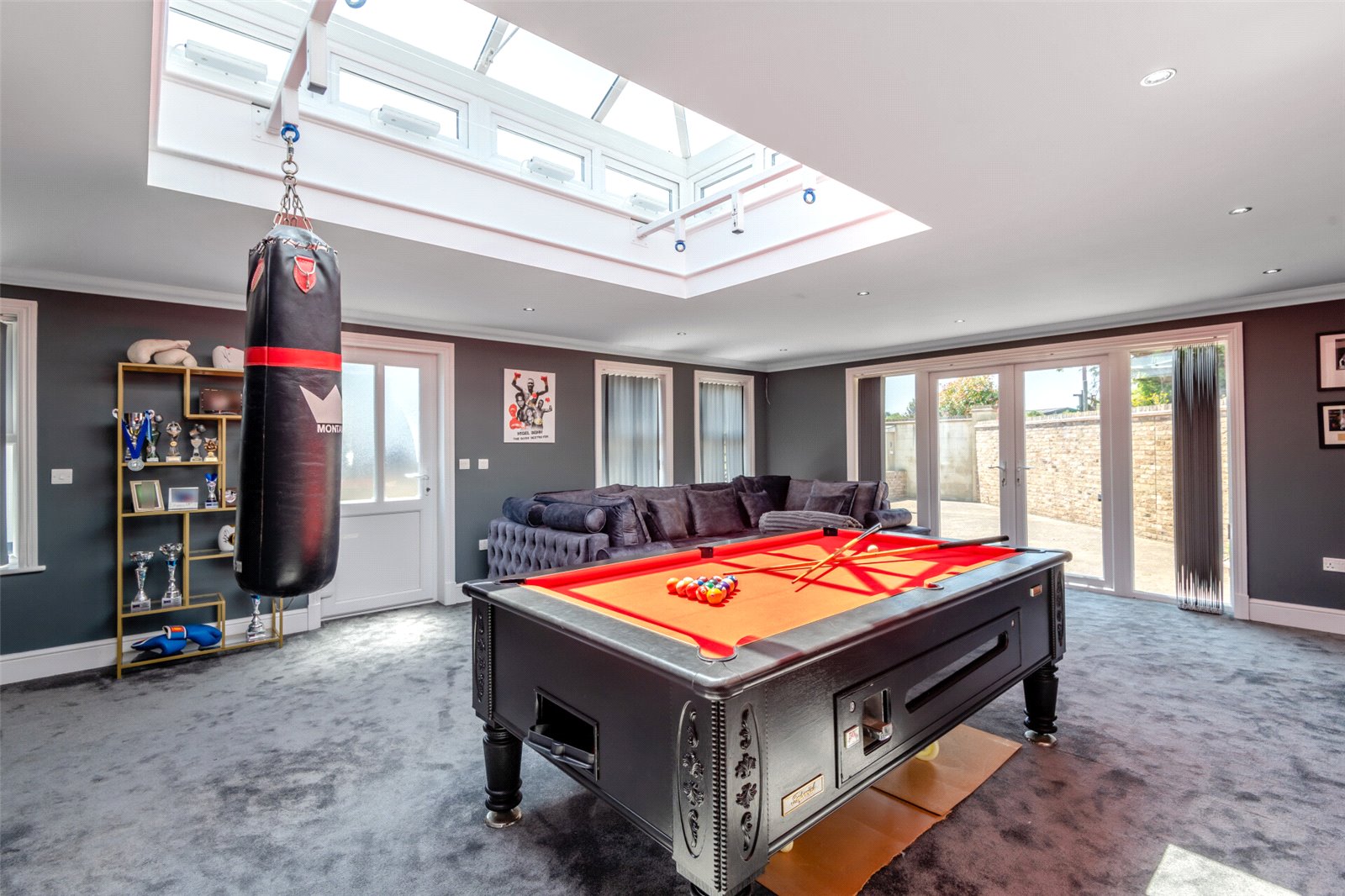 The house has been extended to include a large games and entertainment room with kitchenette, creating a perfect space for gatherings or independent recreation. The adjoining gym and extensive garage provide yet more space and flexibility. This space makes for an ideal annex conversion, subject to the usual consents.