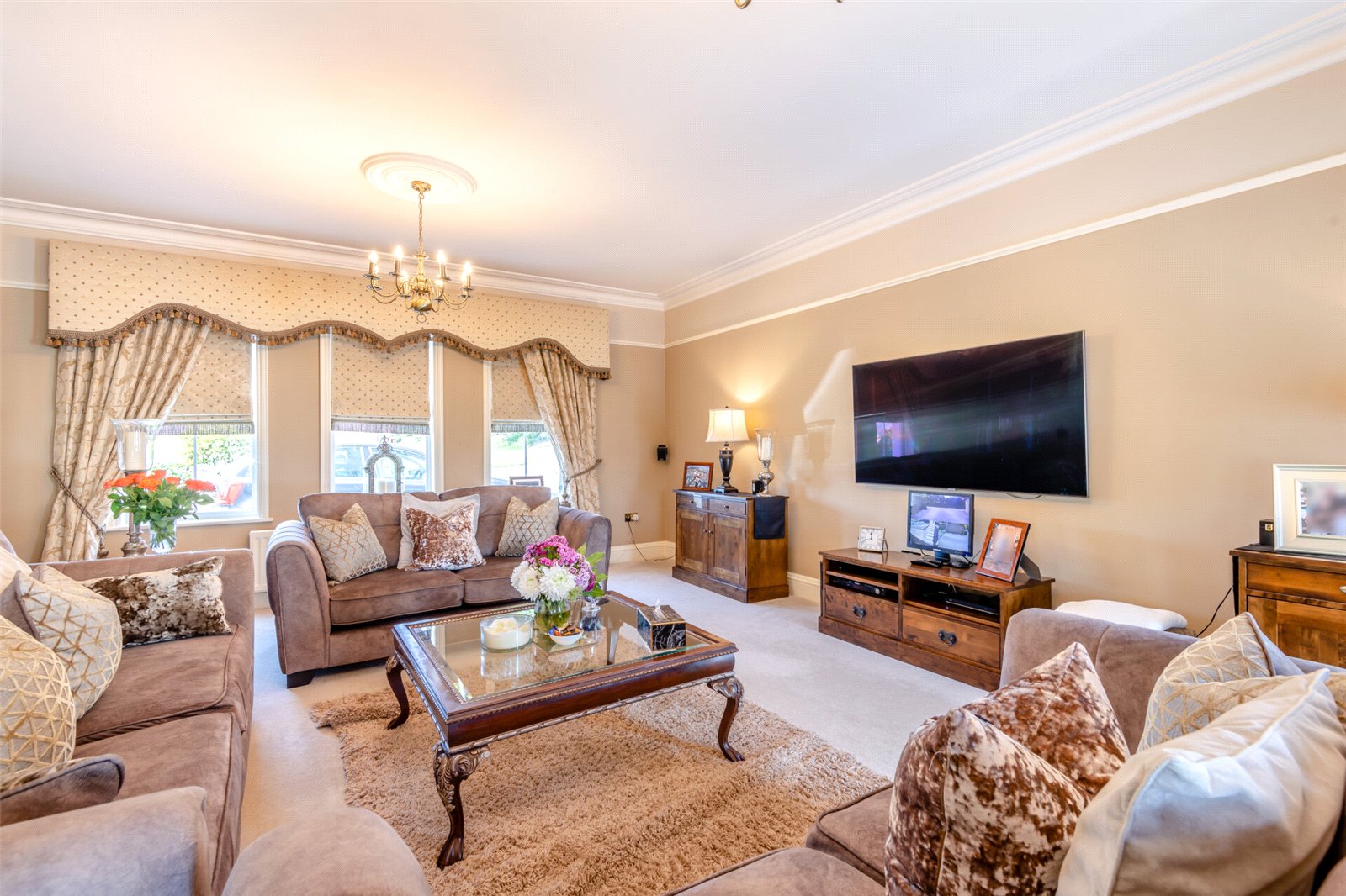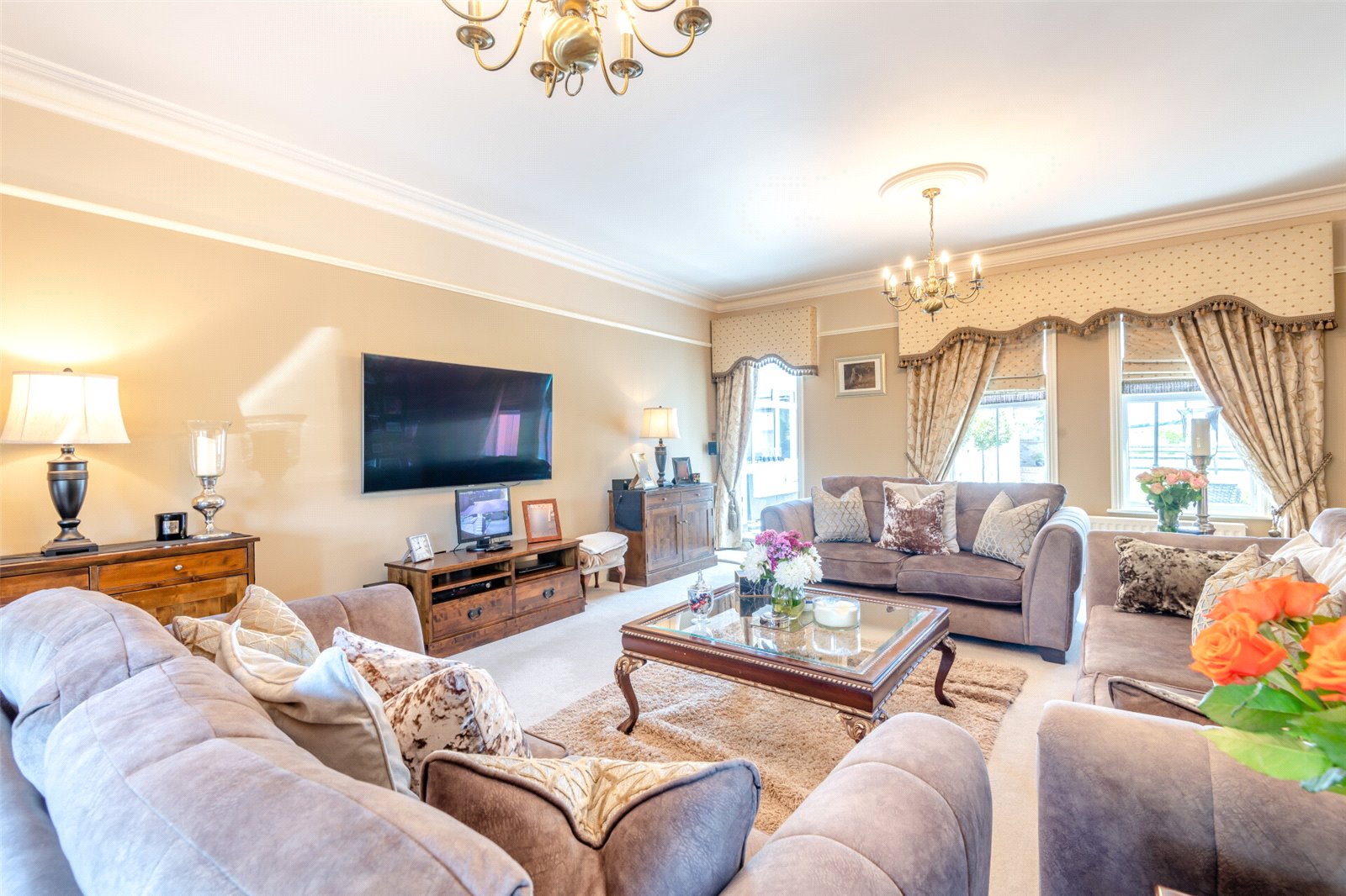 Sitting Room 22'1" x 18' (6.73m x 5.49m). Three double glazed Georgian effect windows to windows to front. Two double glazed Georgian effect windows to windows to rear. Cornice ceiling. Picture rail. Carpet. Two radiators.