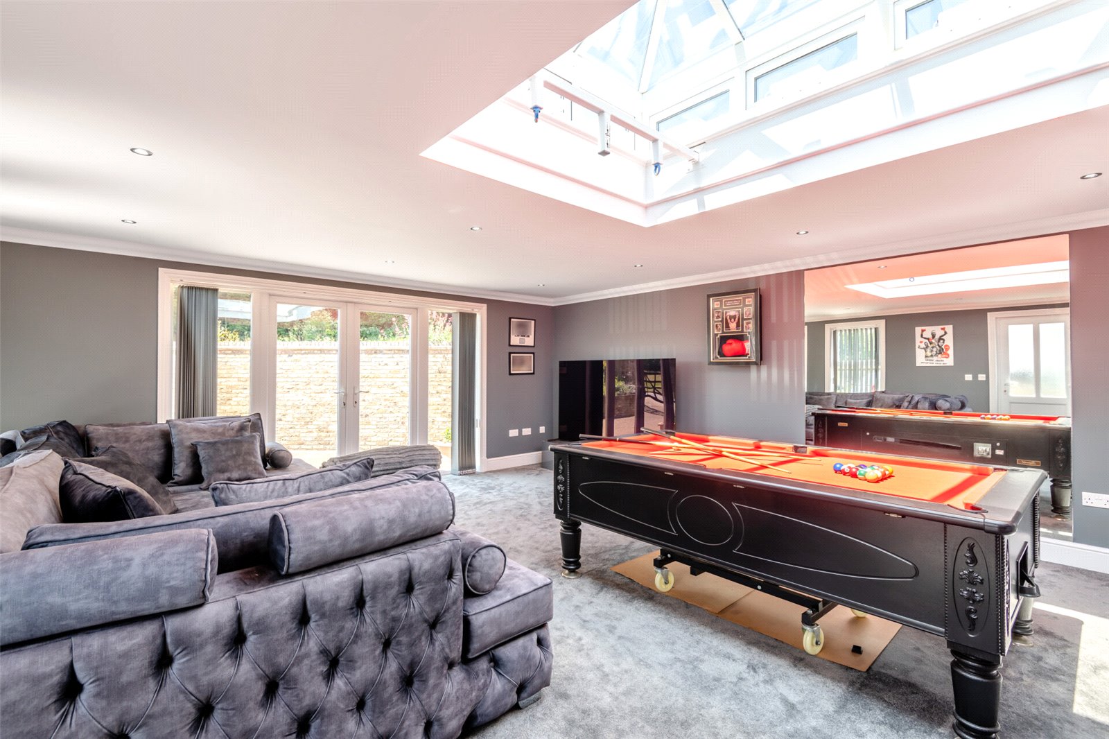 Entertainment/Games Room 30' (9.14m) narrowing to 21' (6.4m) x 18'5" (5.61m) extending to 30' (9.14m). Double glazed door to side. Double glazed French doors to front with full length side glass panels. Four double glazed windows to side. Lantern. Plain ceiling with downlights. Carpet. Base units with stainless steel sink and mixer tap. Local tiling. Consumer unit. Two radiators.