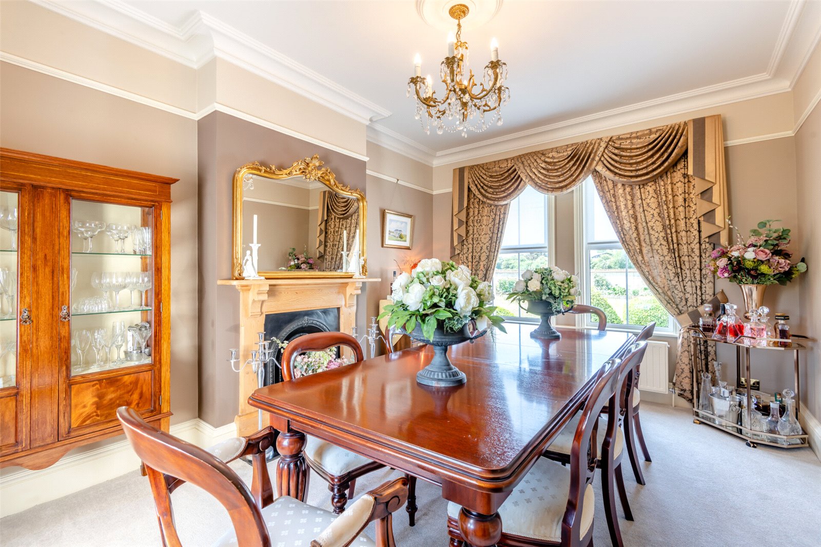 Dining Room 15'3" x 11'4" (4.65m x 3.45m). Two Double glazed Georgian effect windows to front with shutters and double glazed Georgian effect window to rear. Cornice ceiling. Picture rail. Carpet. Feature fireplace & surround. Radiator.