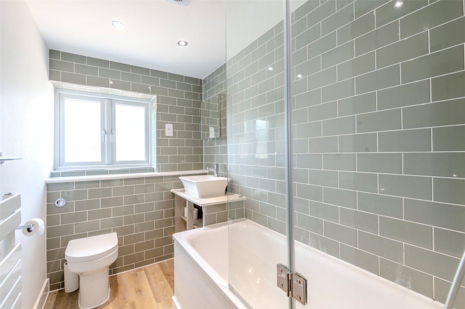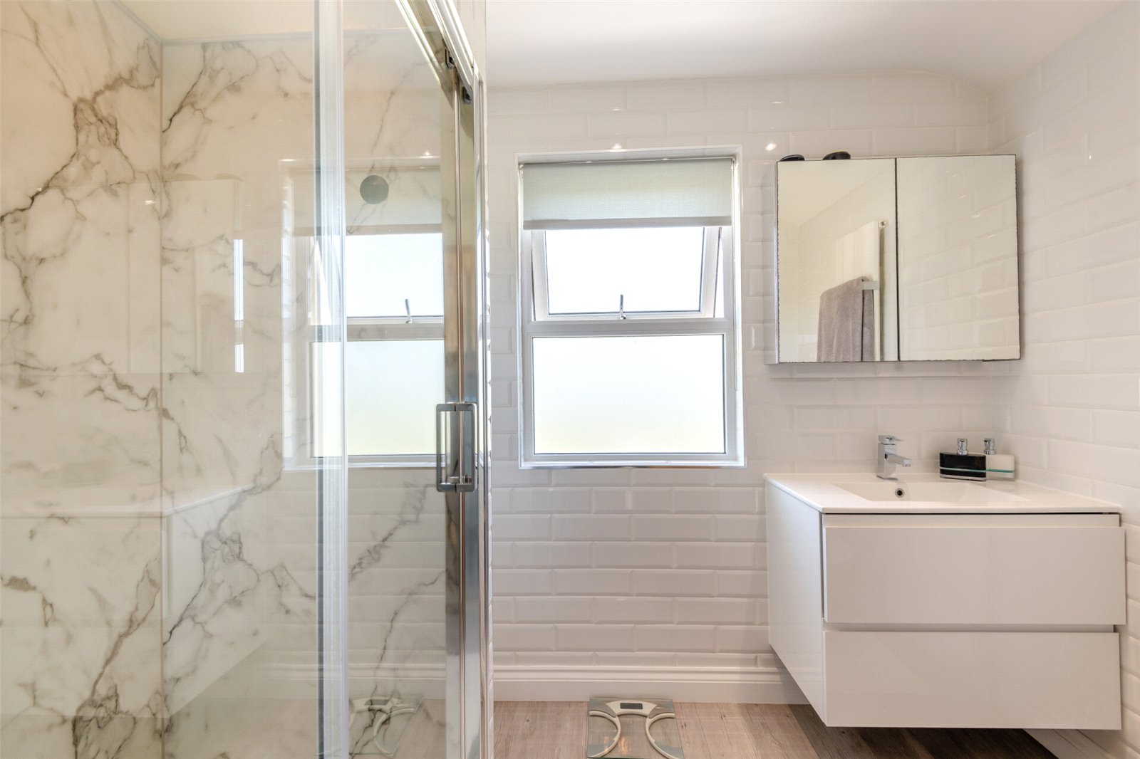 Bathroom Double glazed frosted window to front. Plain ceiling with downlights. Extractor fan. Karndean wood effect flooring. Heated towel rail. Panel bath with mixer taps and shower with screen. Ceramic sink over vanity unit. Low level w.c. Shaver socket. Mirrored cabinet.