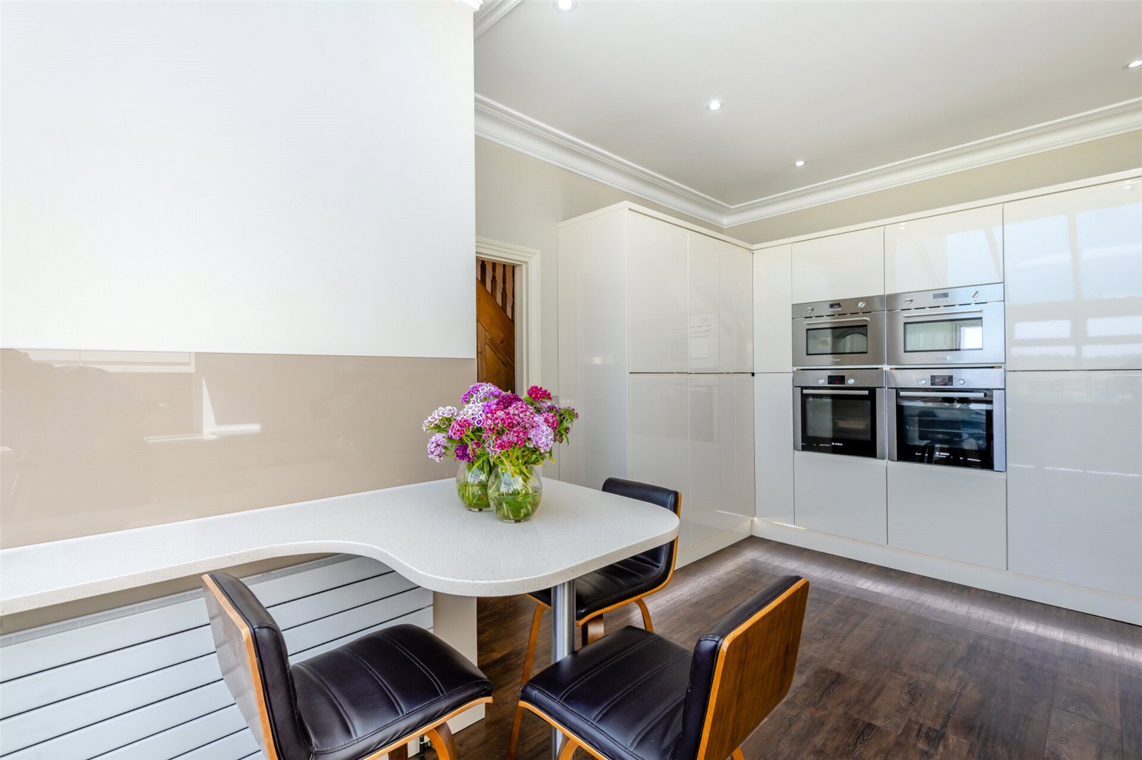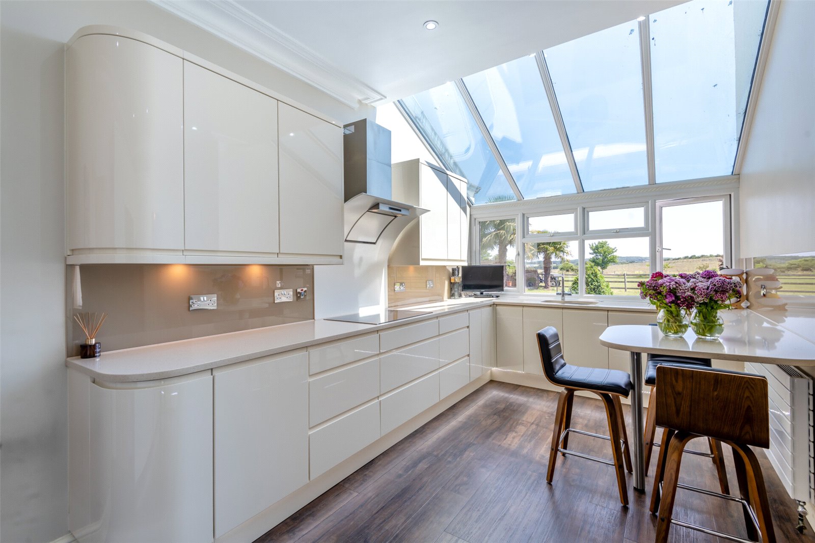Kitchen/Breakfast Room 18'8" x 11'11" (5.7m x 3.63m). Double glazed window to rear. Partially double glazed ceiling. Cornice ceiling with downlights. Amtico wood effect flooring with under floor heating. Wall & base units with quartz worktops over. Breakfast bar. Glass splashback. One & a half sunken stainless steel sink with mixer tap. Cooke & Lewis induction hob with extractor hood over. Two Bosch electric fan ovens. Two Smeg microwave ovens. Bosch freezer. Zanussi Fridge. Tall corner storage cupboard. Radiator.