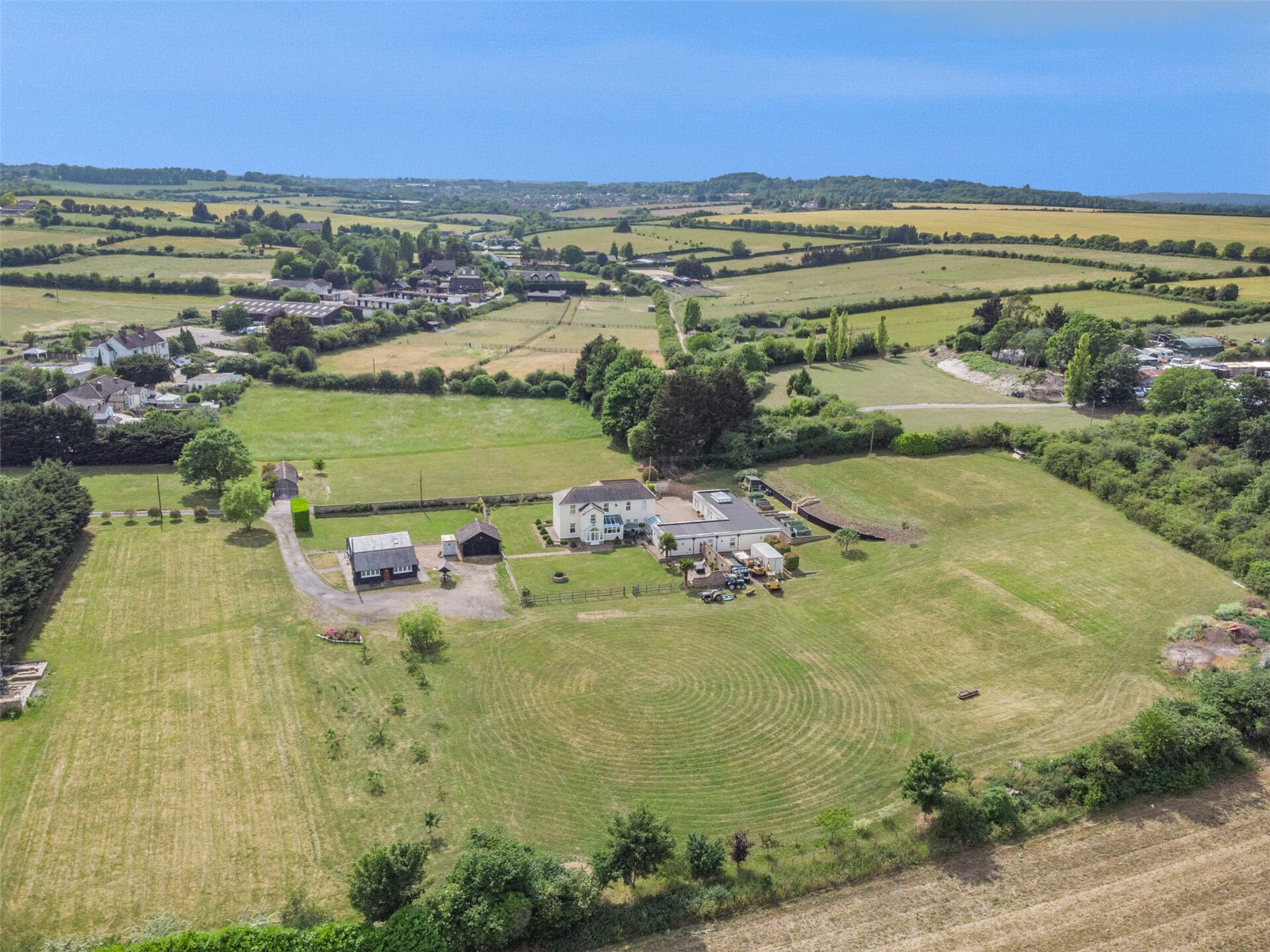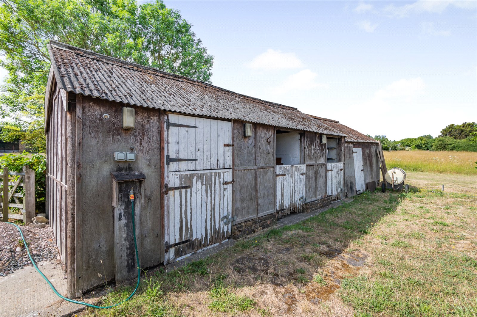 Ayers Place sits within approximately 6.8 acres of private wraparound grounds and gardens that are as generous as they are tranquil. There are patio seating areas, sweeping lawns, established hedgerows, mature planting, and fruit trees. Two natural wells offer a rare feature, and the plot includes a detached garage, potting shed, additional store, and three stables with a feed/tack room ideal for those with equestrian interests that may wish to explore adding paddocks or simply wishing to embrace country living.