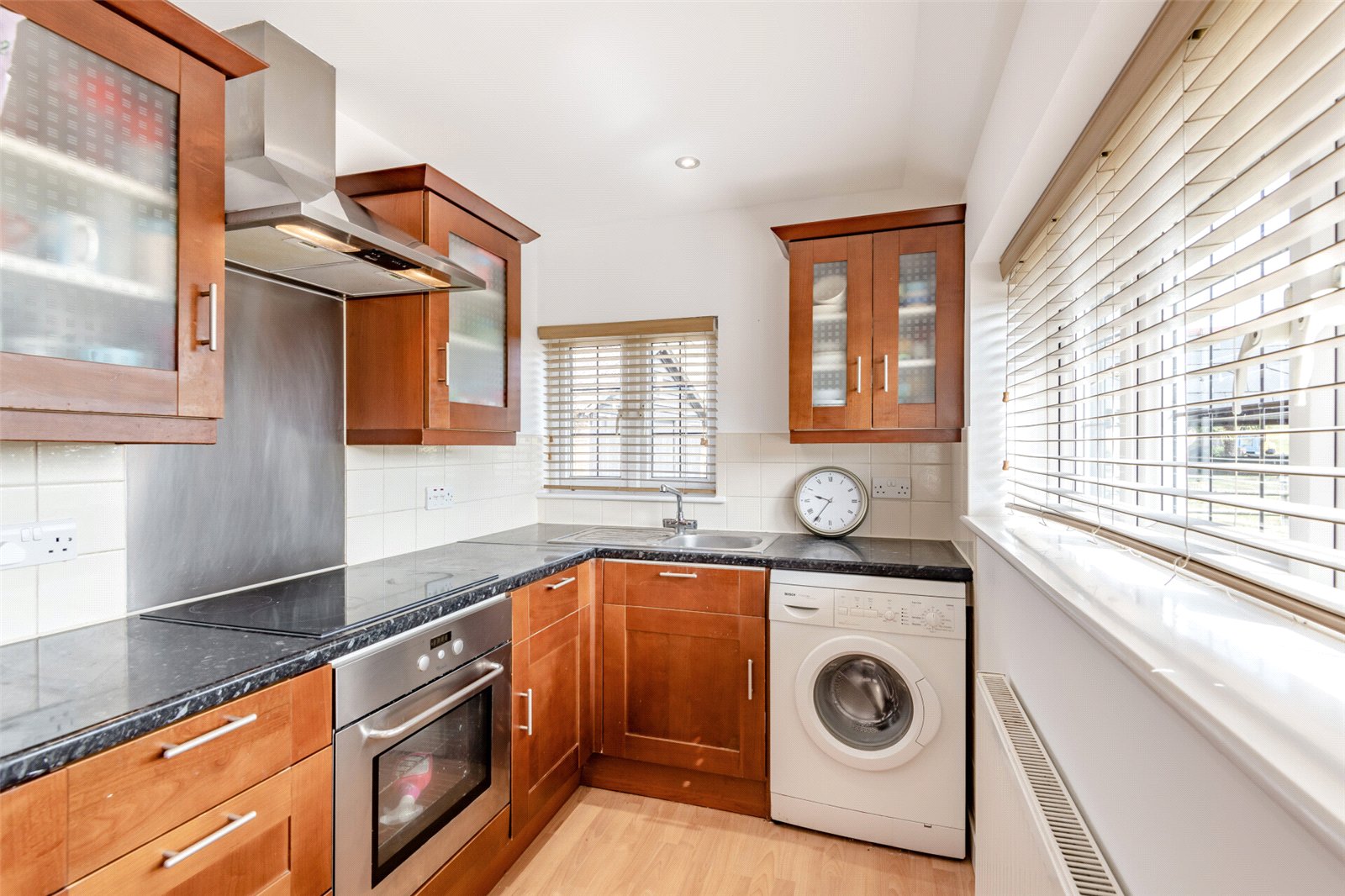 Kitchen Area Double glazed leaded light effect window to front and side. Plain ceiling with downlights. Laminate wood effect flooring. Wall & base units with work top over. Stainless sink & drainer with mixer tap. Lamona induction hob with splash back & Whirlpool extractor hood. Whirlpool electric oven. Indesit fridge freezer. Space for washing machine. Local tiling