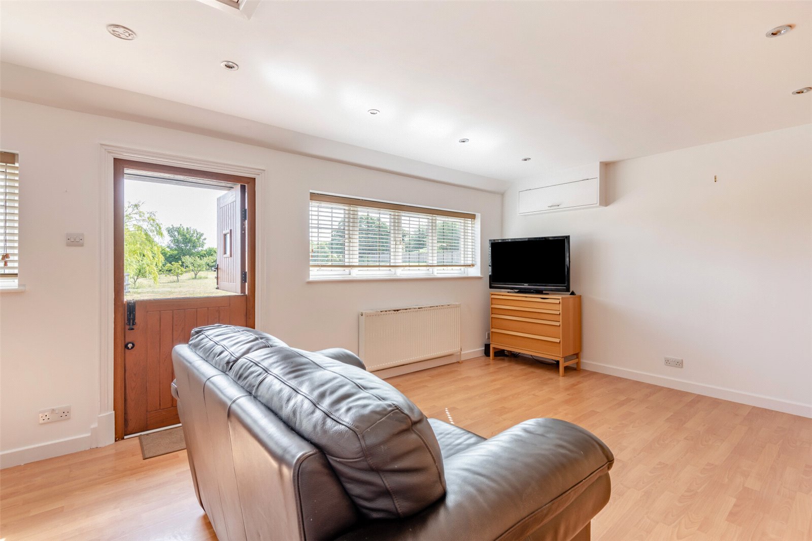 Sitting Room/Bedroom Area 25'2" x 12'10" (7.67m x 3.9m). Double glazed door to front. Double glazed door to rear. Double glazed leaded light effect window to front. Plain ceiling with downlights. Laminate wood effect flooring. Cupboard housing consumer unit & meter. Radiator.