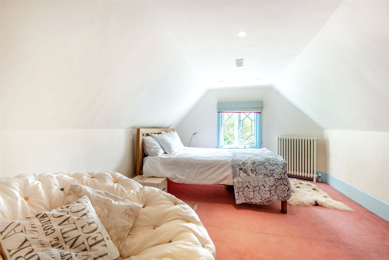 Landing Skylight, fitted carpet, plain apex ceiling, downlights, and Victorian cast-iron fireplace. Built in cupboards on two walls. Smoke alarm
