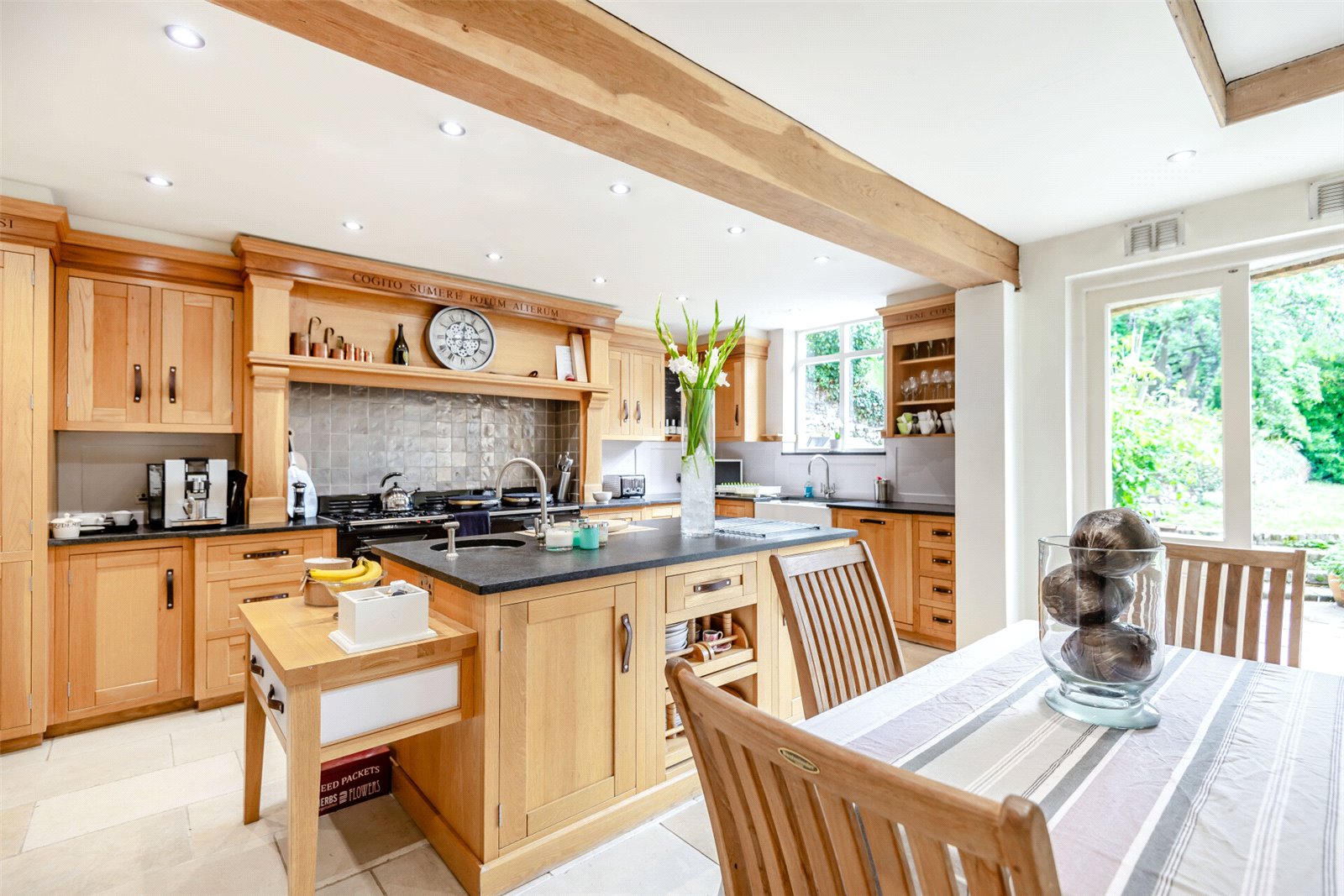 Kitchen Breakfast Room 19'5" x 16'6" (5.92m x 5.03m). Double doors to the side, window to the side, flagstone flooring with electric underfloor heating. Plain ceiling with downlights. Solid oak wall and base units, floor to ceiling larder cupboard & central island, all with granite work surfaces, painted wood panelling/splashbacks and titanium tiles locally to the cooking area. Double butler sink with mixer tap and additional sink with mixer tap, hydro tap and in-built chopping board are located in the island unit. A two-pod gas-fired AGA, with two hot plates & two ovens, plus an AGA gas hob and double electric fan oven pod. Integrated Miele dishwasher, built in fridge, two pull-out plate shelves. Smoke alarm.
