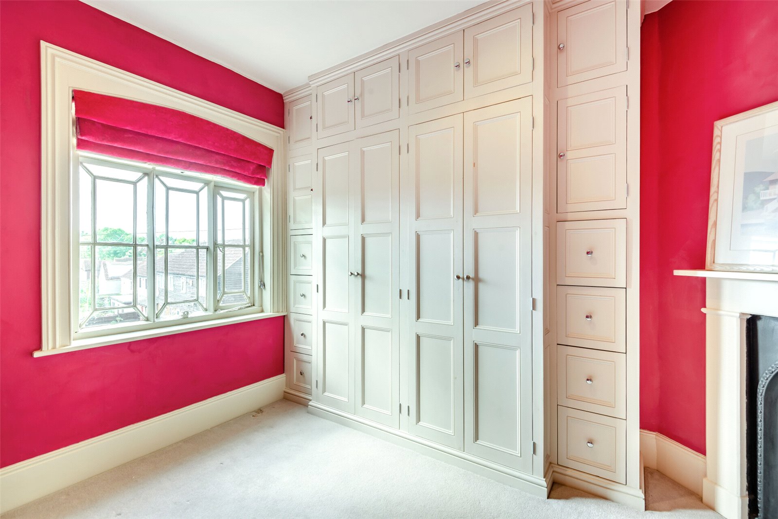 Bedroom 11'1" x 12'3" (3.38m x 3.73m). Window to side, fitted carpet, plain ceiling, downlights, upright radiator. Built-in shelving/storage cupboards either side of Victorian Marble cast iron fireplace.