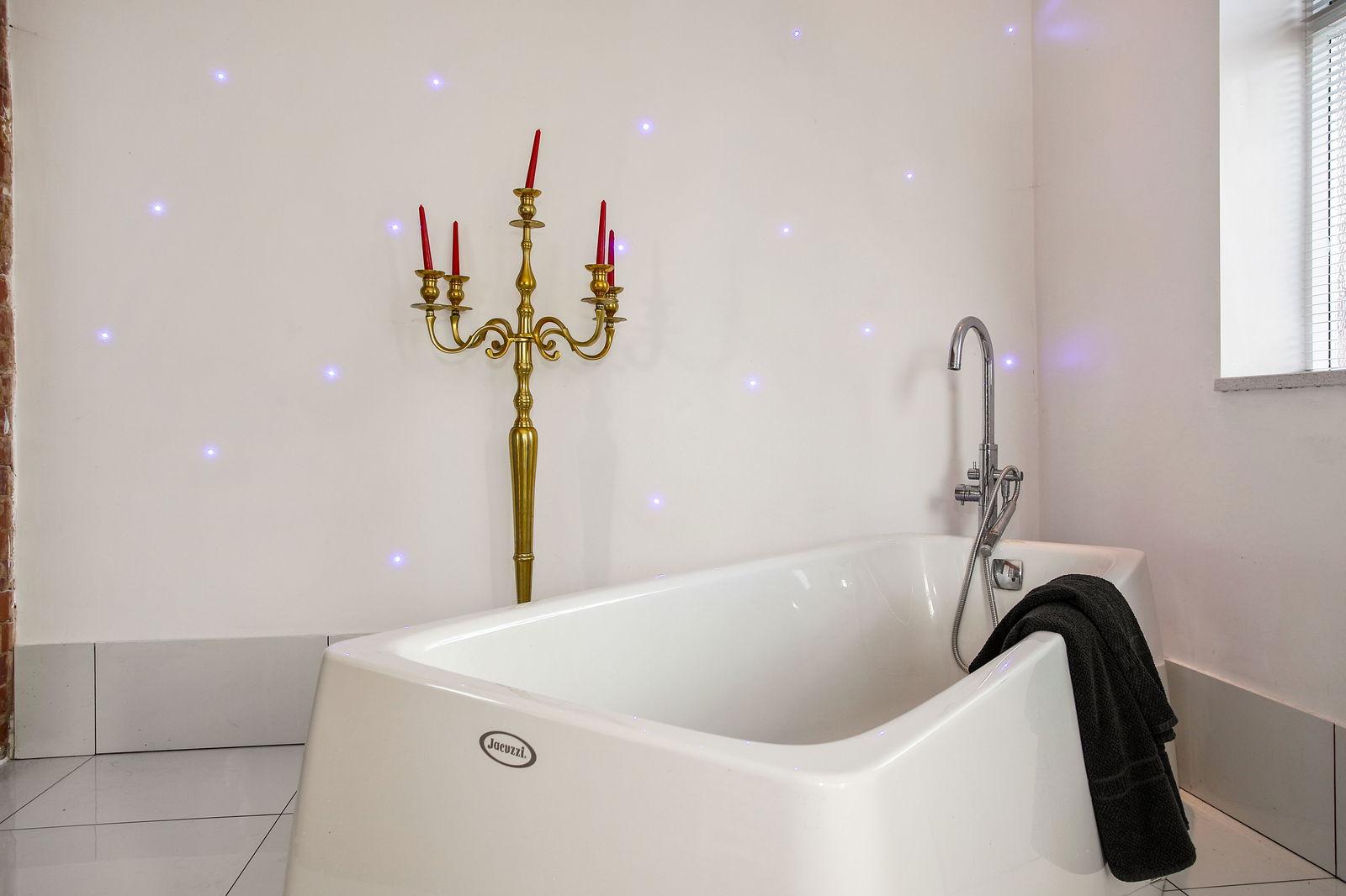 There is a useful walk-in store cupboard, a family bathroom which is presented with a modern five piece suite consisting of a step-in double shower with a fixed glass screen, a floating wash hand basin, a bidet, W.C., and a free standing jacuzzi bath. Full tiling to the floor exposed brick to one wall, two opaque windows, a contemporary styled vertical radiator, and a towel radiator.