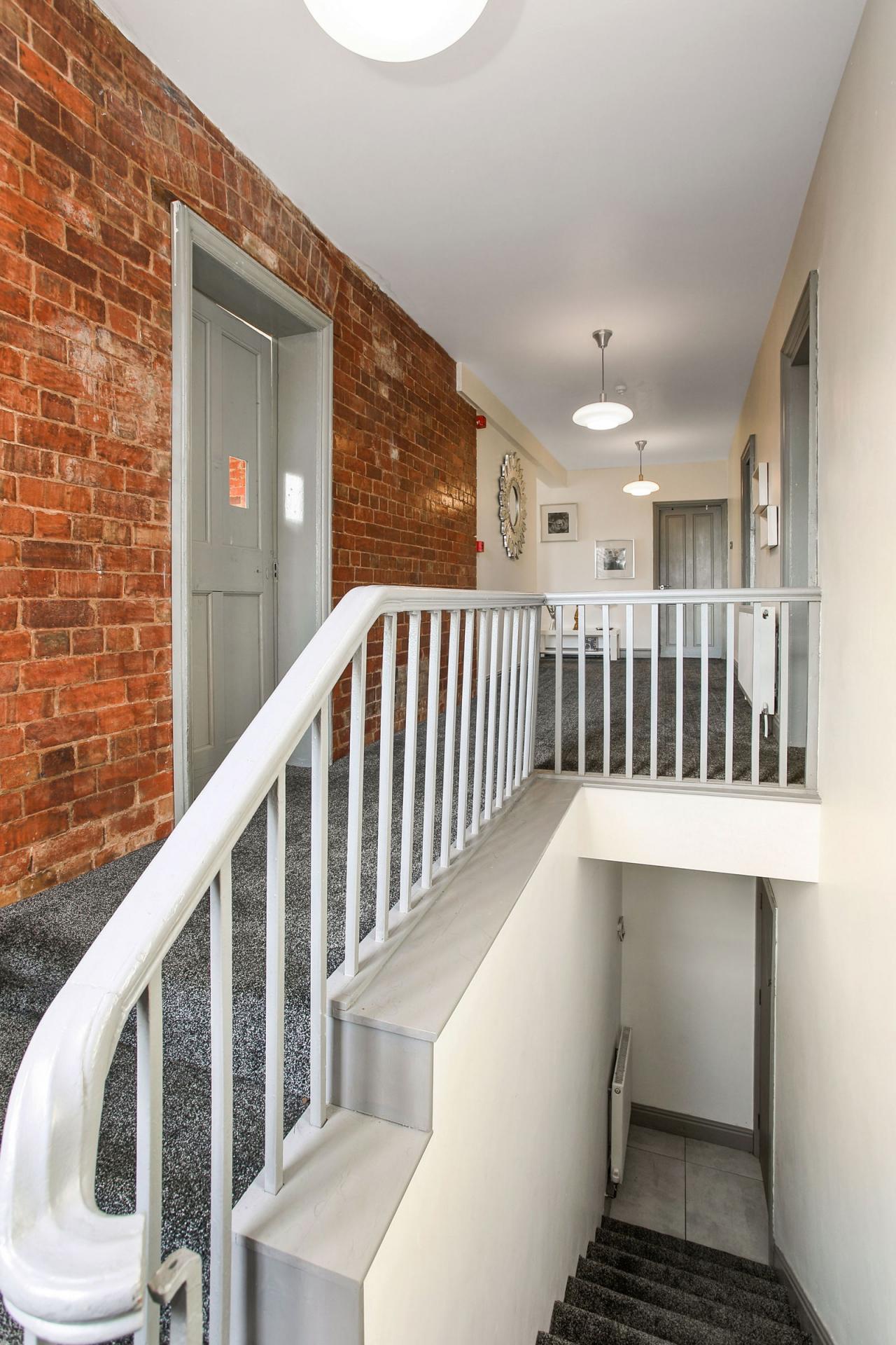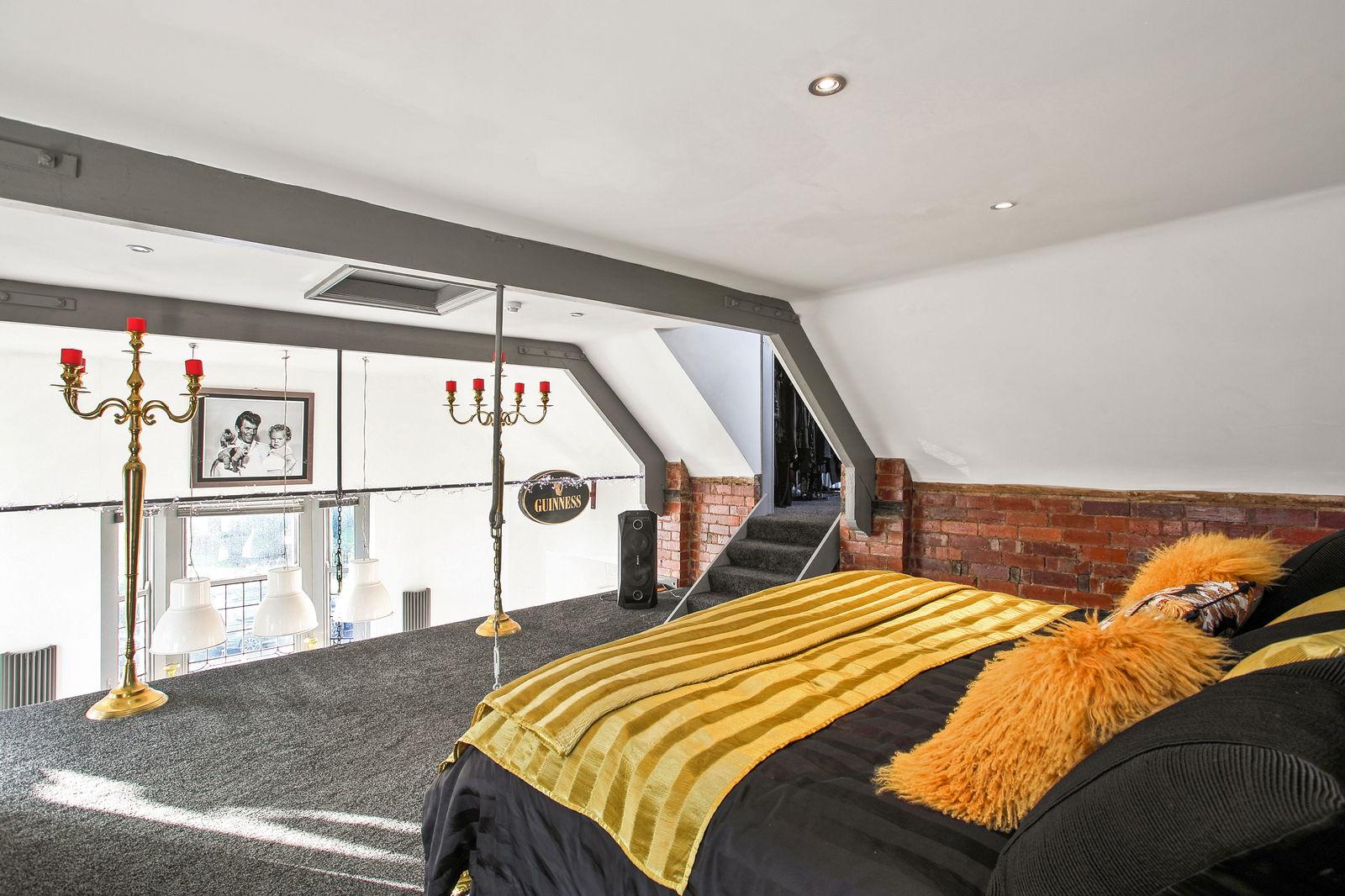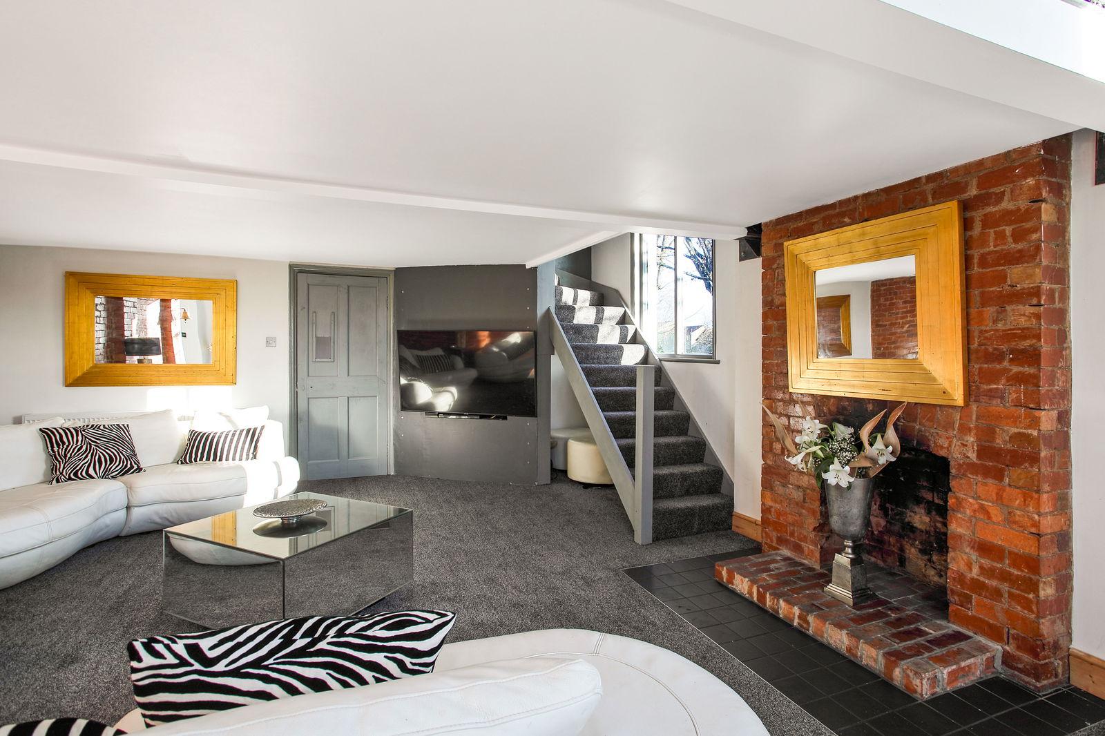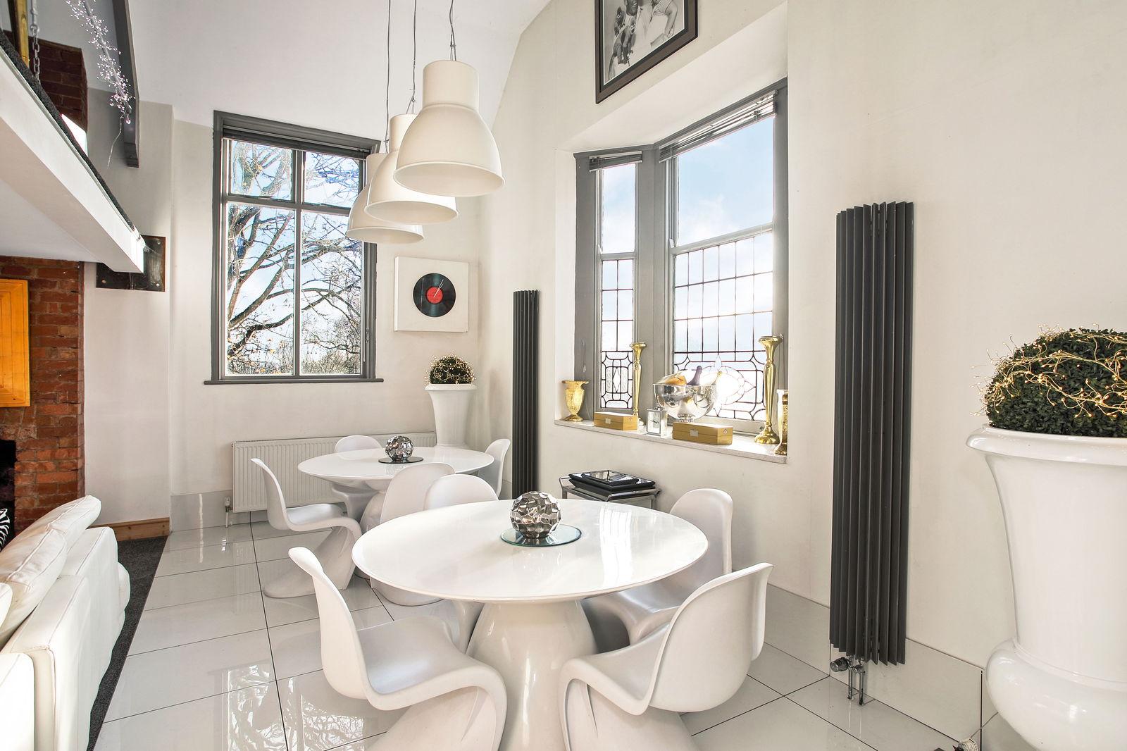 The lounge has a feature exposed brick wall to one aspect of the room, a radiator, exposed brick chimney breast and a staircase to the mezzanine bedroom suite. From the lounge, open plan access is gained to a dining area which enjoys a double aspect position, windows inviting an abundance of natural light indoors. This area of the room has full tiling to the walls and floor, two contemporary style vertical radiators and open plan access to the dining/living kitchen. The kitchen offers generous proportions; a social space ideal for entertaining, has full tiling the floor, a sash window to the front aspect of the building and a contemporary styled radiator. Presented with a complementary range of furniture comprising base and wall cupboards with quartz work surfaces that incorporate a drainer with an inset one and half bowl sink with a mixer tap over with instant hot tap and splash back behind. A central island has a quartz surface with cupboards and drawers beneath, incorporates a four ring hob and extends to a breakfast bar. A complement of appliances includes an oven with two warming drawers, a steam oven, a microwave oven, space for an American style fridge freezer and plumbing for a dishwasher.