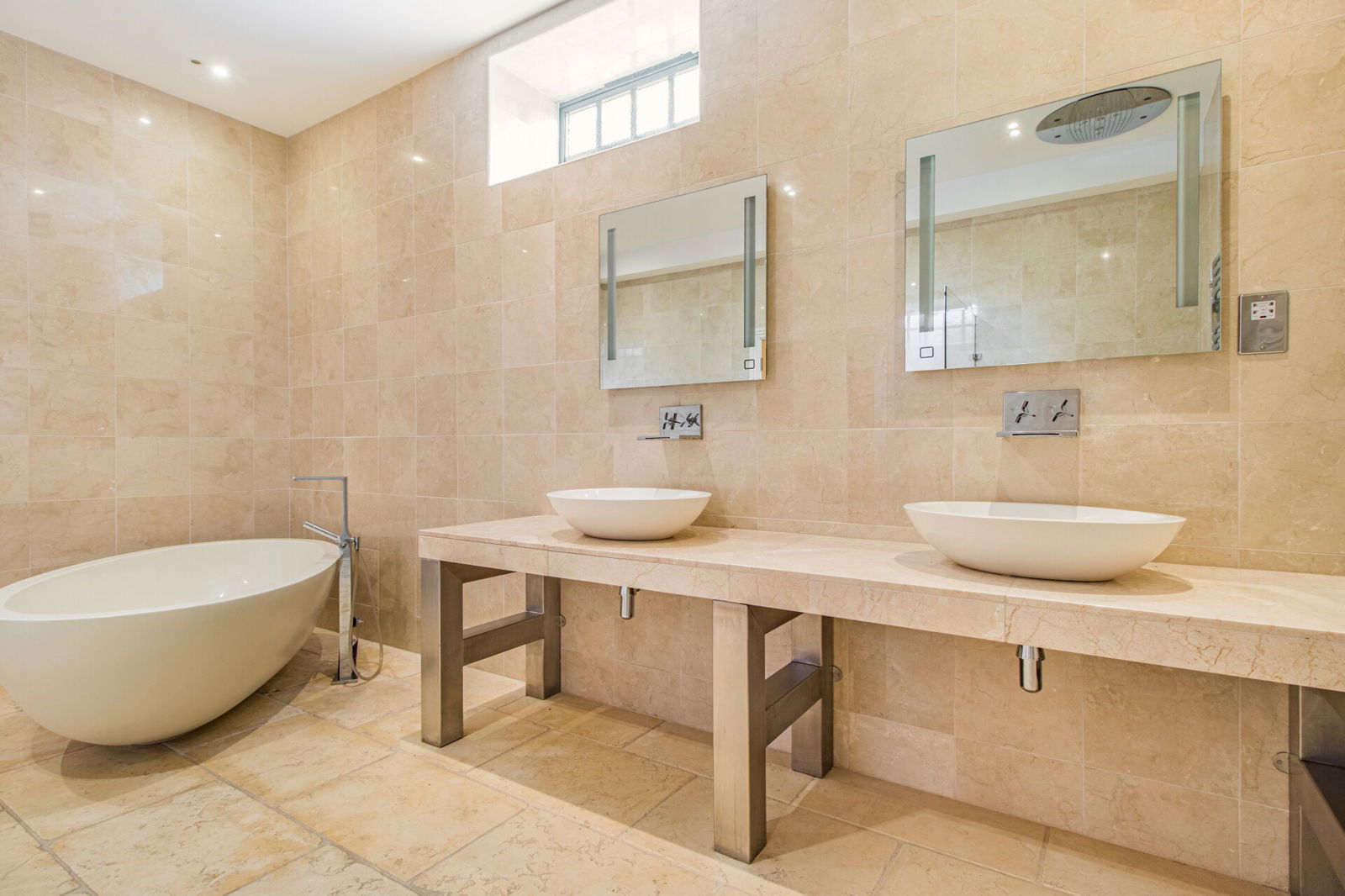 The house bathroom offers generous proportions and is presented with a six-piece suite, consisting of a wet room style walk-in shower with a fixed glass screen, twin wash hand basins which sit on a complimentary tiled base, each with mixer waterfall taps over and a mirrored backdrop, a bidet, a low flush W.C and a free-standing oval shaped bath. The room has complimentary tiling to the walls and floor and a frosted window.