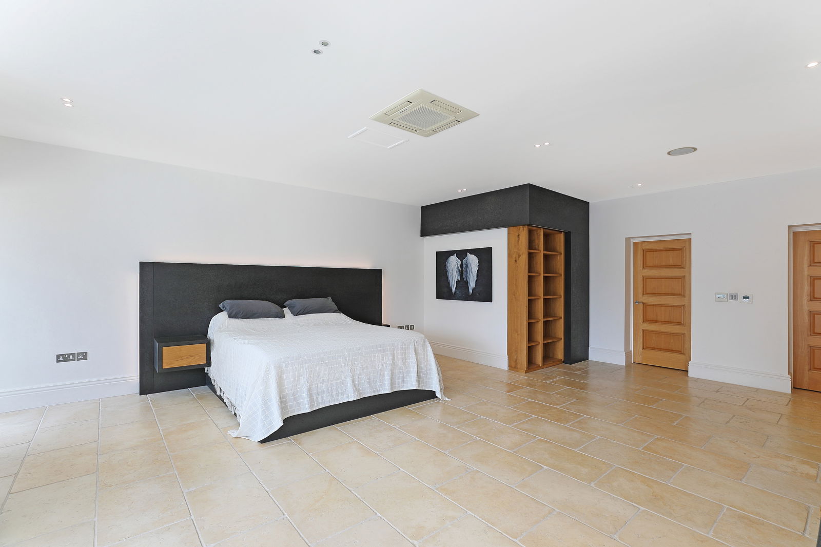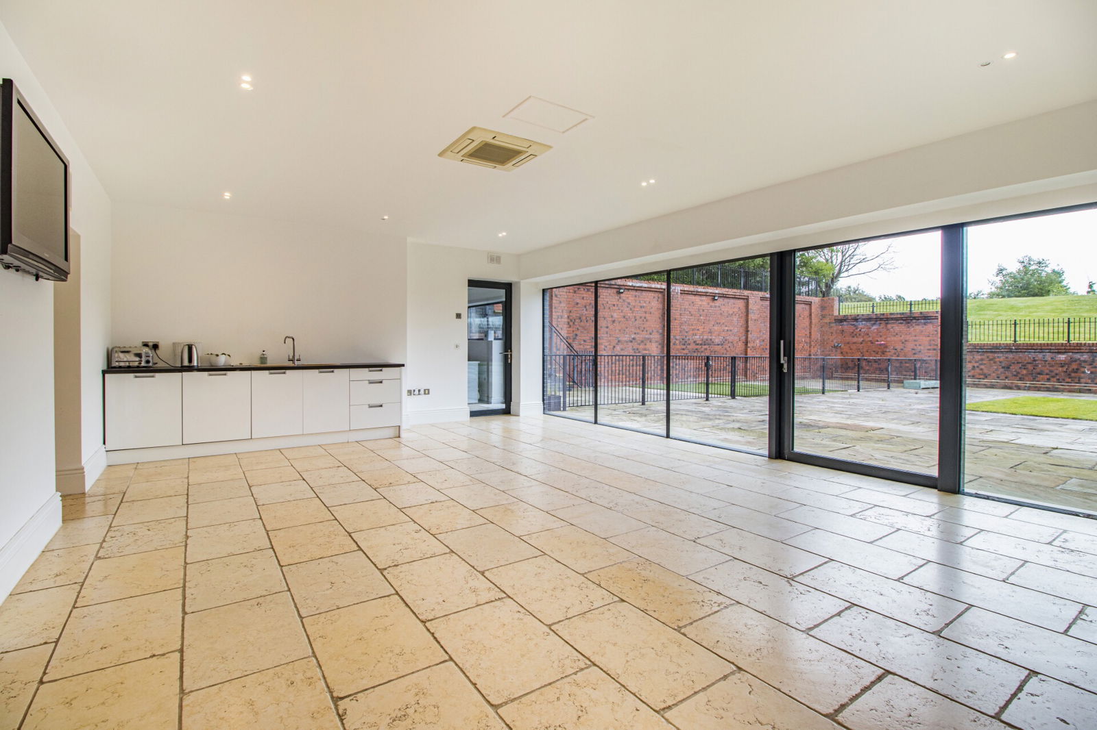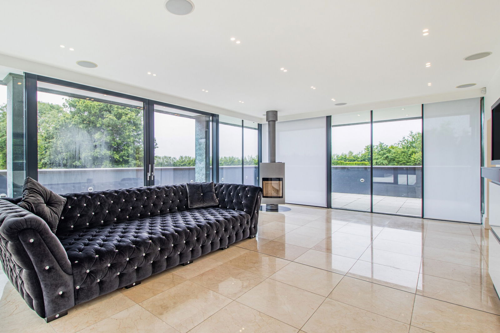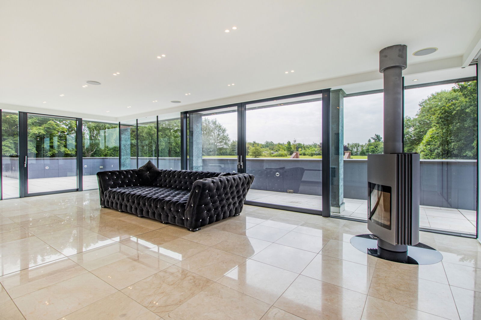 The reception hallway is flooded with natural light, mainly from a bank of glazing offering a delightful outlook over the grounds, whilst a sliding door opens directly onto the terrace. There is a staircase to the lower ground floor and twin doors gain access to the entertainment suite, which offers versatile accommodation, has a marble tiled floor and full height glazing to three aspects, offering panoramic views over the grounds, whilst giving access to the sun terrace which wraps the rear of the home connecting the internal accommodation to the outside. There is a wood burning stove and a bespoke bar area with a black glass surfaces incorporating a sink unit, base cupboards and a professional glass washer.