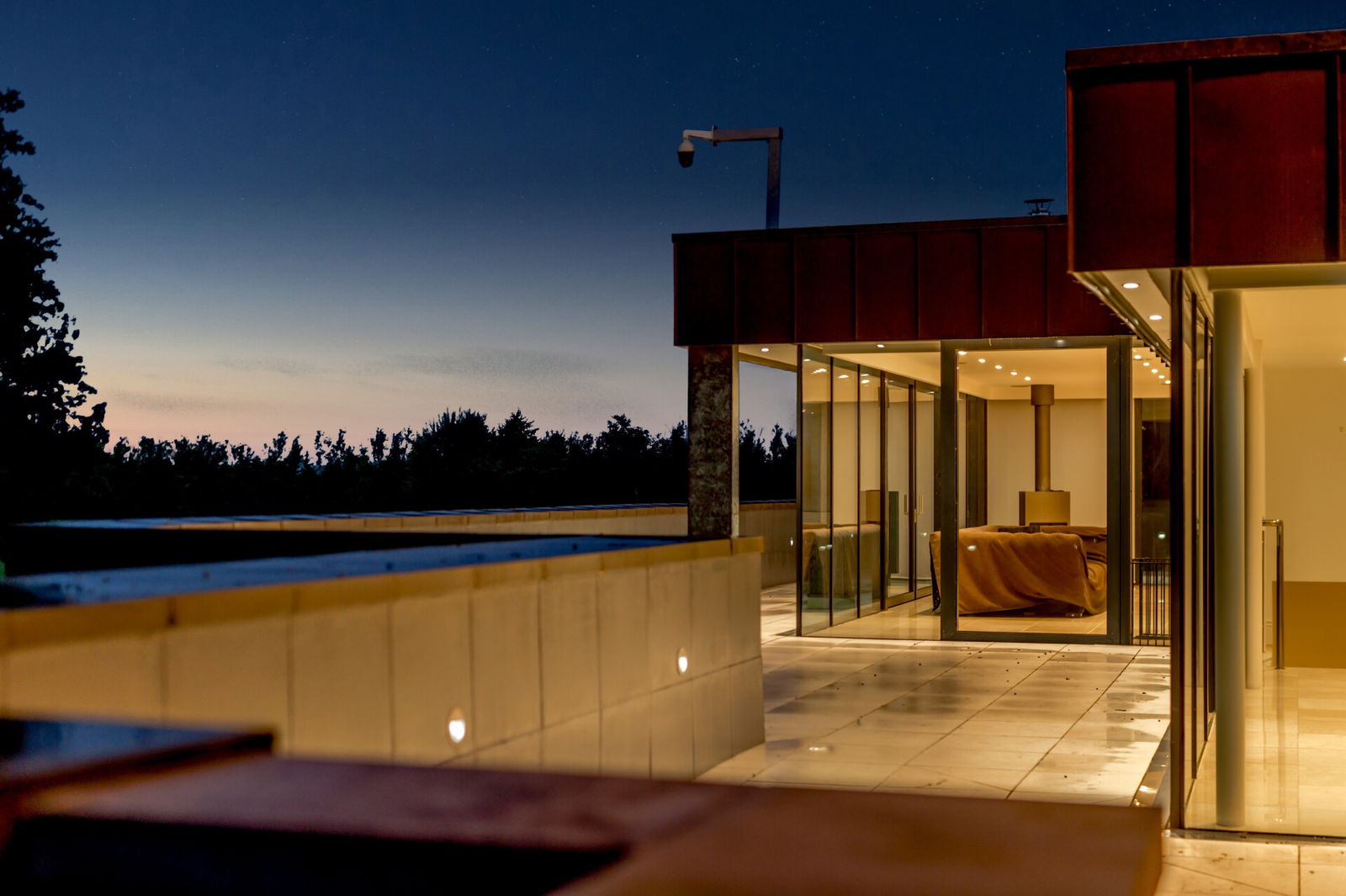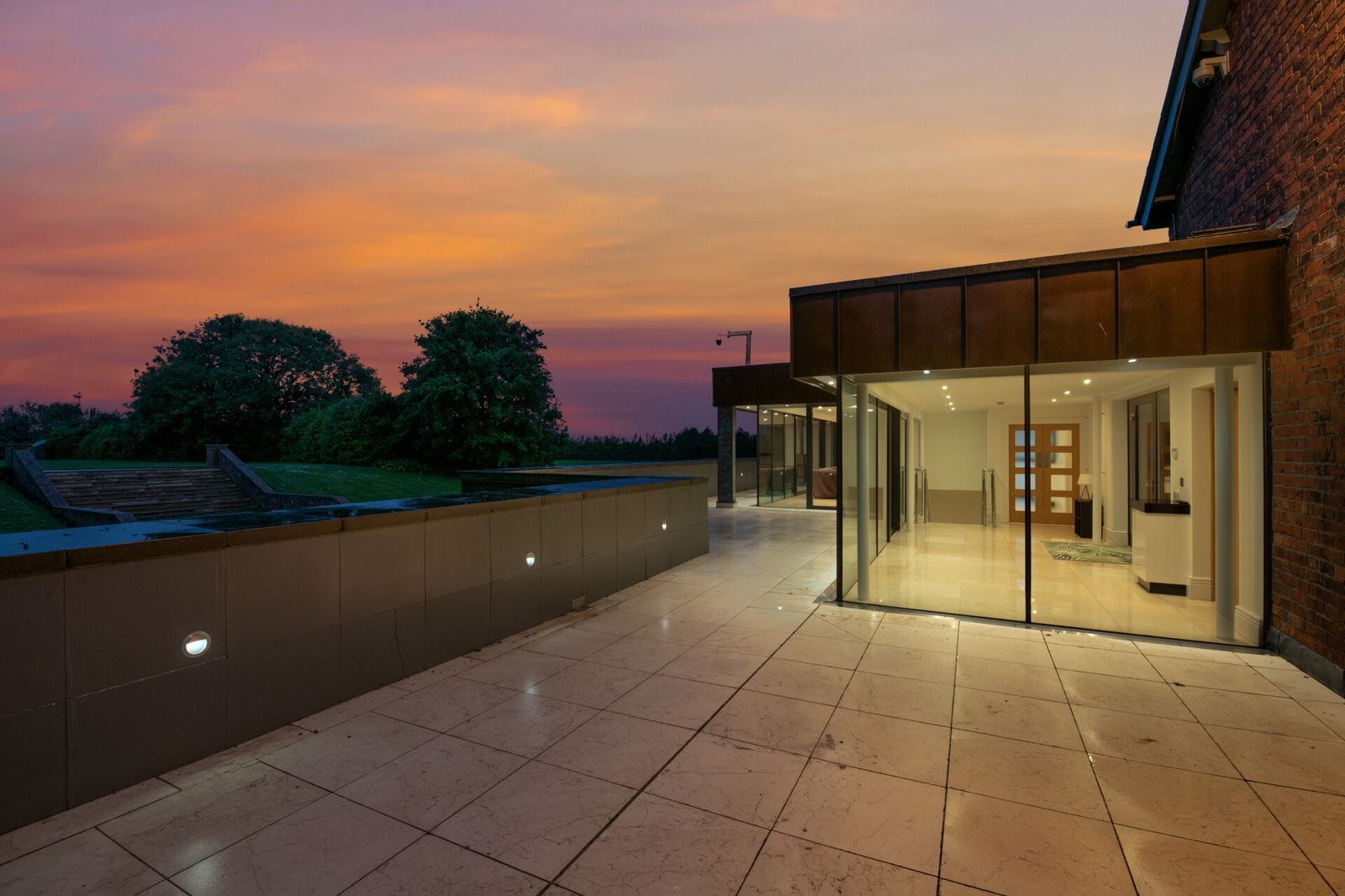 Steps lead to a terrace at the front of the house before accessing the main reception to the property. At the immediate rear of the property, positioned off the kitchen, hallway and entertainment suite is a generous balcony terrace, wrapping the rear of the home; feature tiling to the floor and concealed LED lighting, commanding an impressive view over all aspects of the grounds.