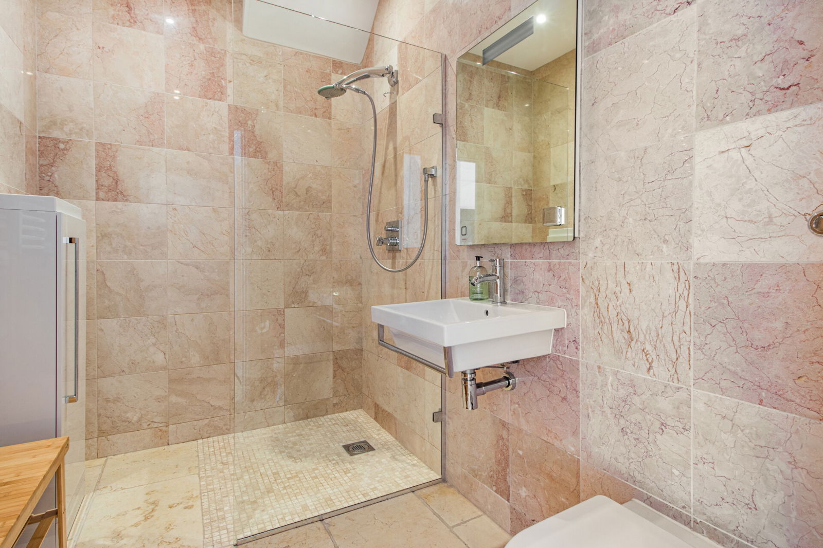 To the remainder of the ground floor, all positioned to the rear aspect of the home are three additional double bedrooms. Two similar sized rooms each have a bank of full height windows forming the rear aspect of the room with an inset sliding door opening onto the external courtyard, the rooms have a limestone laid floor, fitted wardrobes and en-suite facilities comprising a floating wash hand basin with a mirror over, a low flush W.C and a step-in wet room style shower with a fixed glass screen.