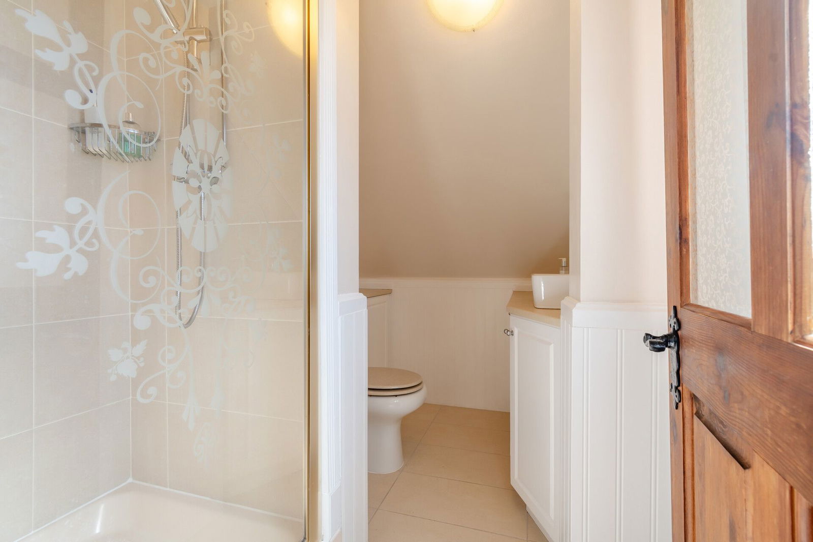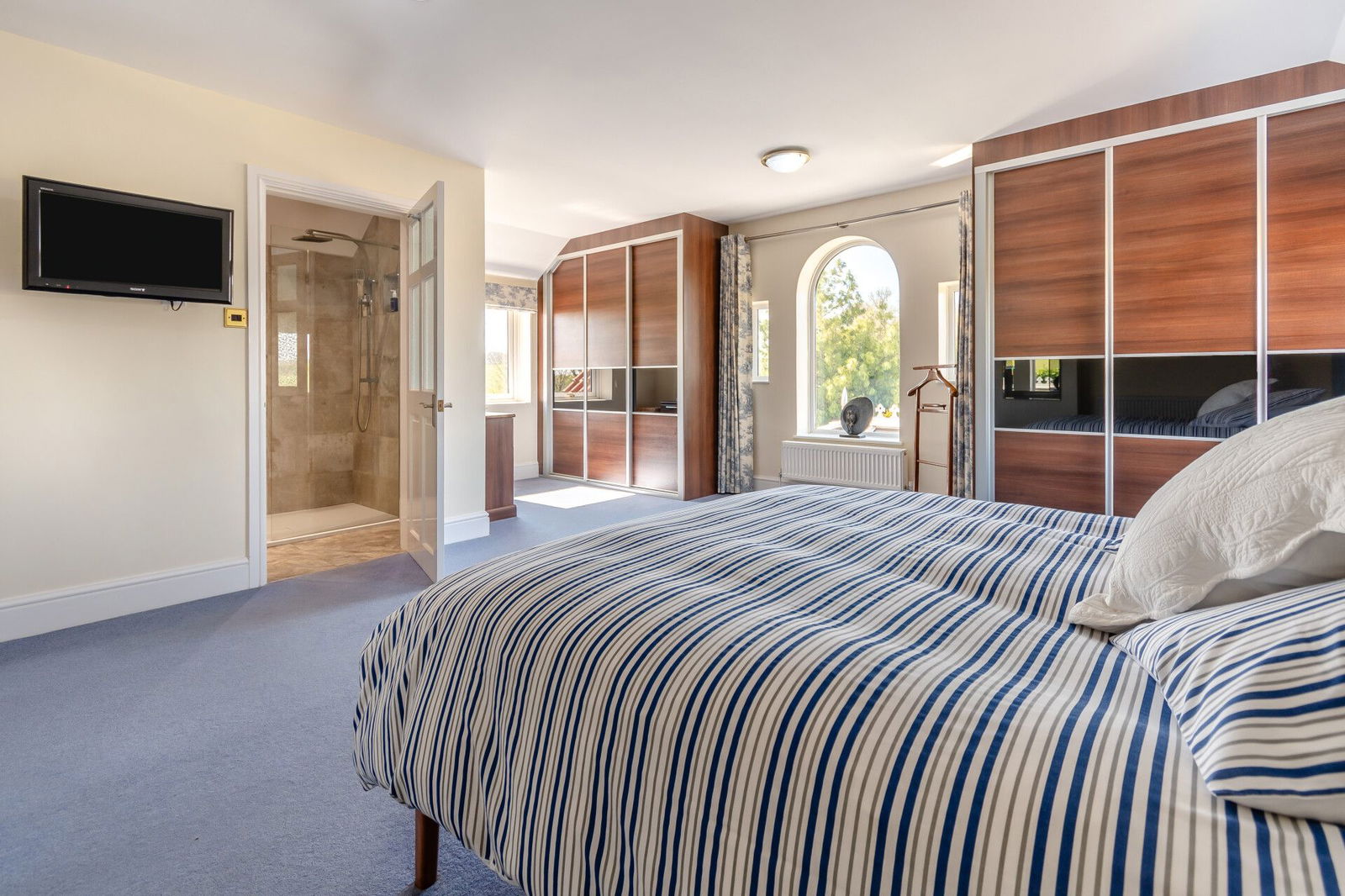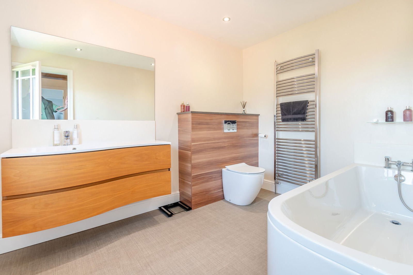 The principal bedroom suite is positioned to the rear of the home and is exceptional from all viewpoints; a generous bedroom with windows to three aspect commanding stunning views over the gardens and surrounding countryside. There are fitted wardrobes, a dressing area and en-suite accommodation incorporating a low flush W.C, a wall hung wash hand basin and a shower with a fixed glass screen, all complemented by feature tiling and a vertical radiator.