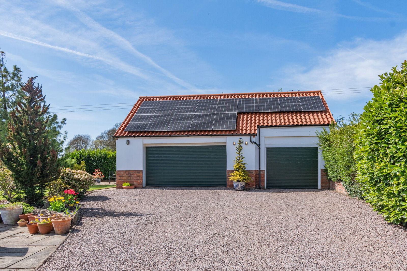 A brick-built garage with a double and single bay, two electronically operated entrance doors, power, lighting and a car charging point. First floor storage space and solar panels.