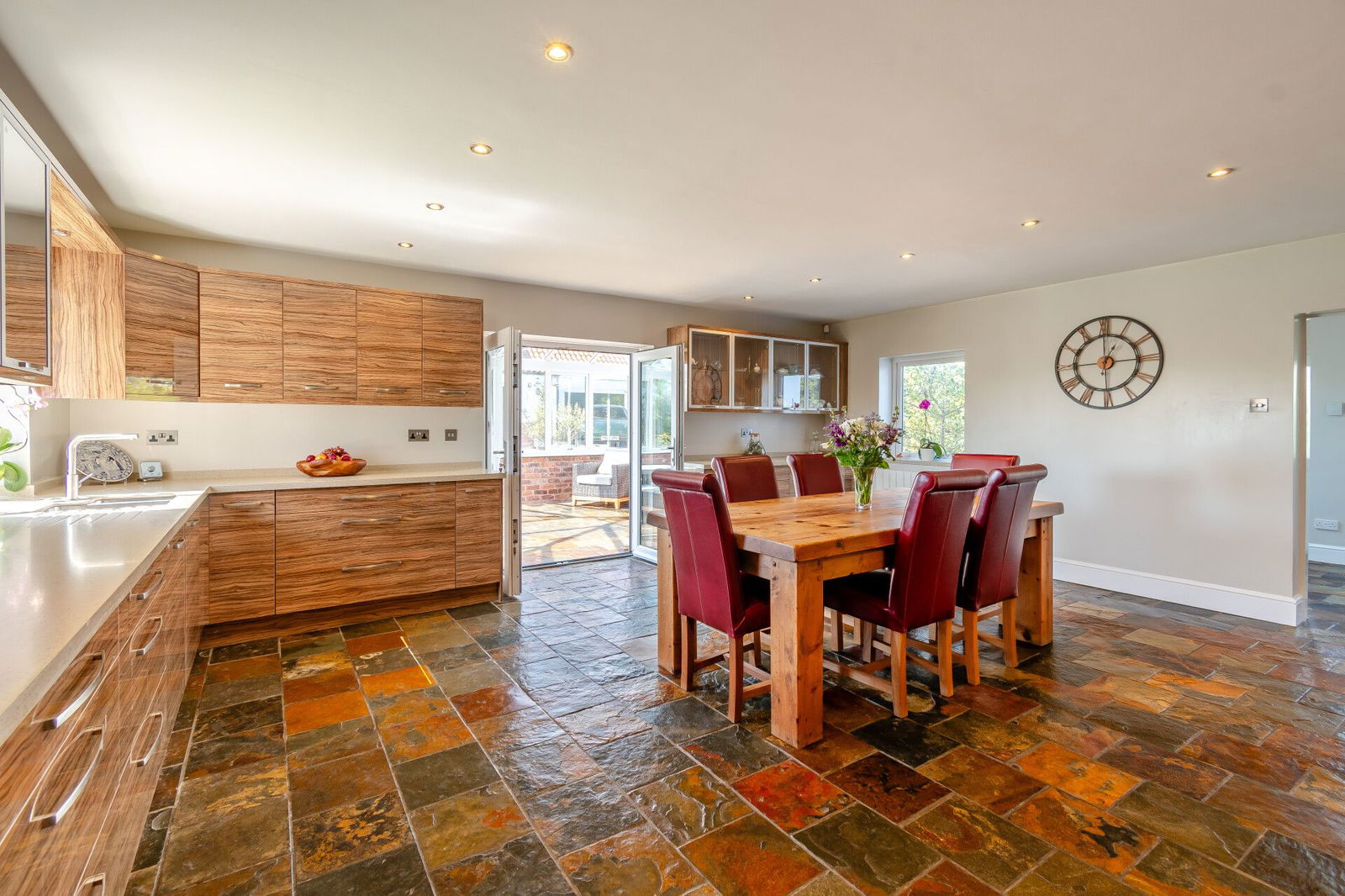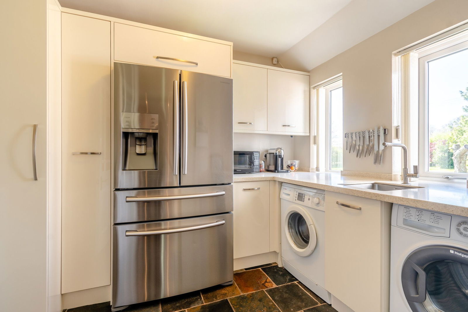 An adjoining utility has furniture with a worksurface and an inset sink, two windows, full tiling to the floor, plumbing for an automatic washing machine and a dryer, and within the units, a larder style fridge freezer.