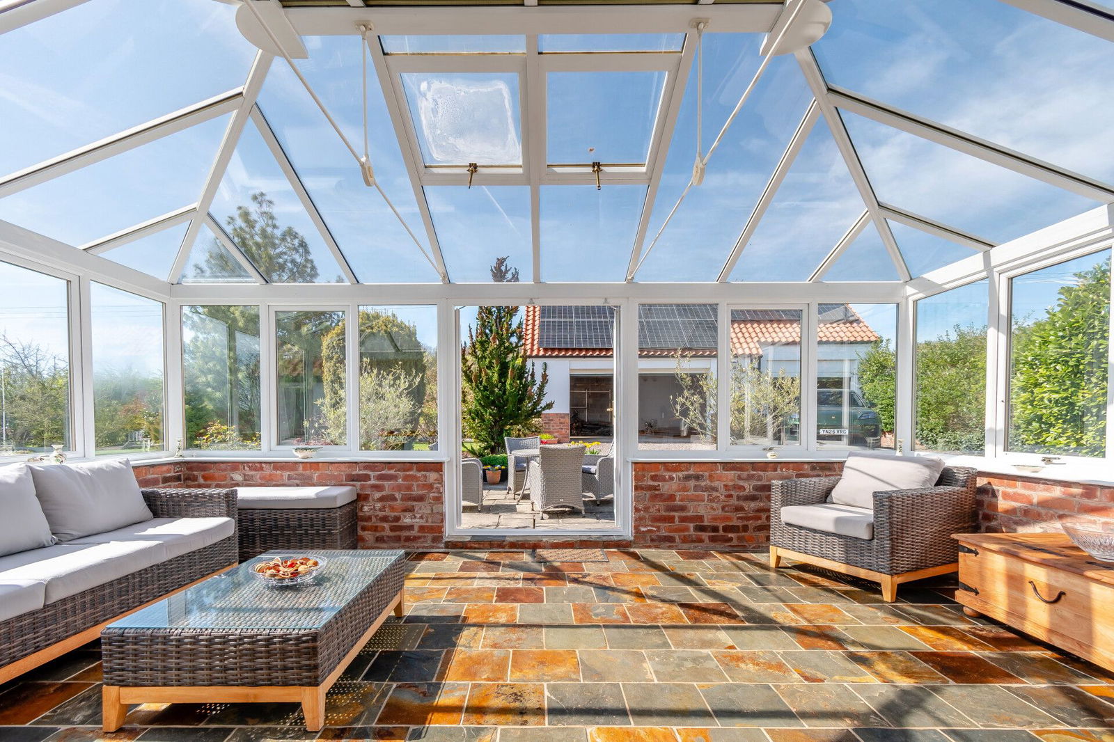 The garden room offers spacious accommodation, is flooded with natural light, commands impressive views over the gardens whilst twin doors open directly onto an external terrace.