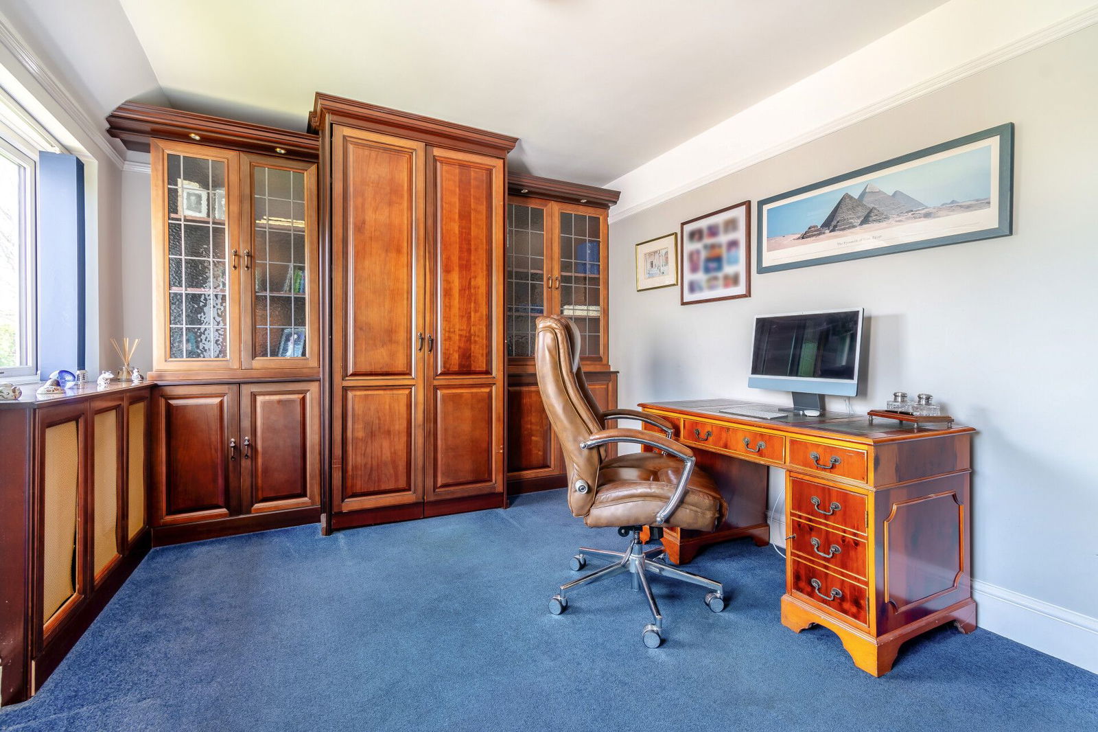 A home office offers versatile accommodation, is positioned to the front of the home, has two windows and fitted cupboards to one wall.