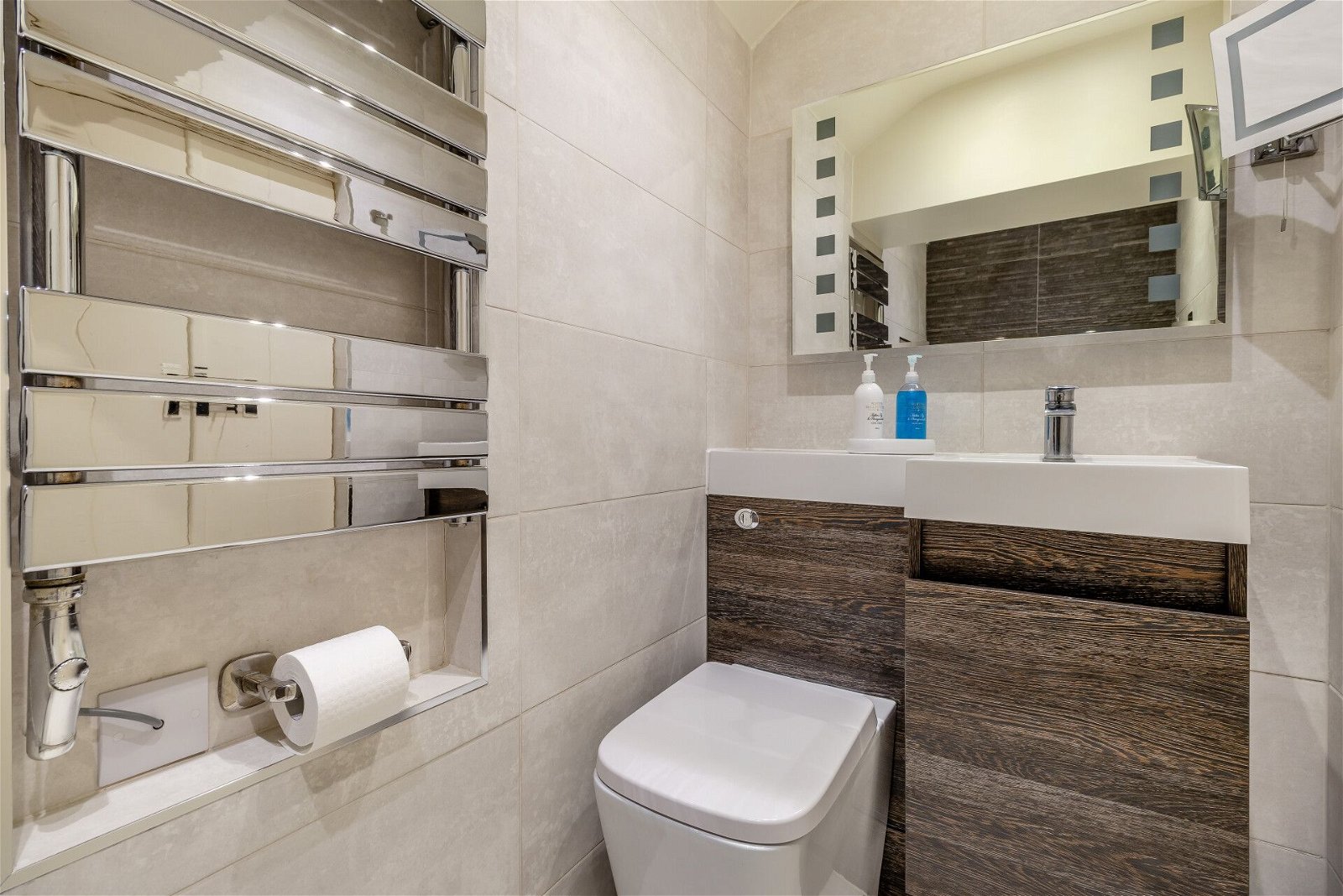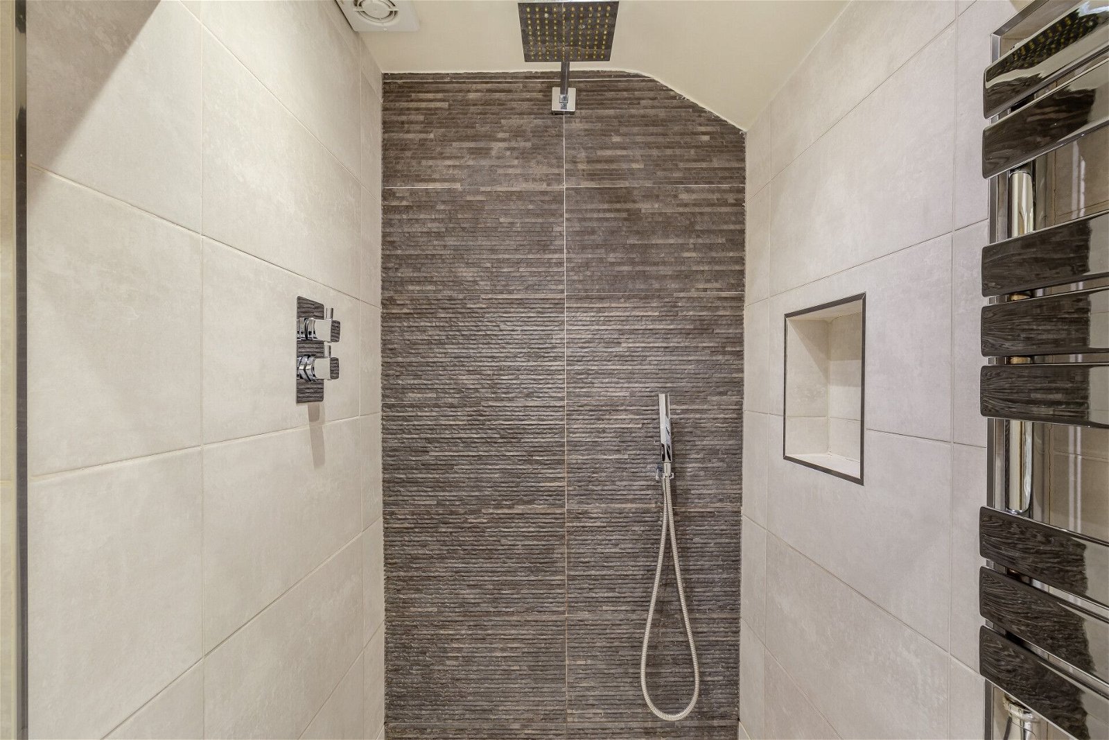 A shower room with electric under floor heating presents a wet-room style shower, a low flush W.C, and a wash hand basin, complimented by full tiling to the walls and floor and a heated chrome towel radiator.