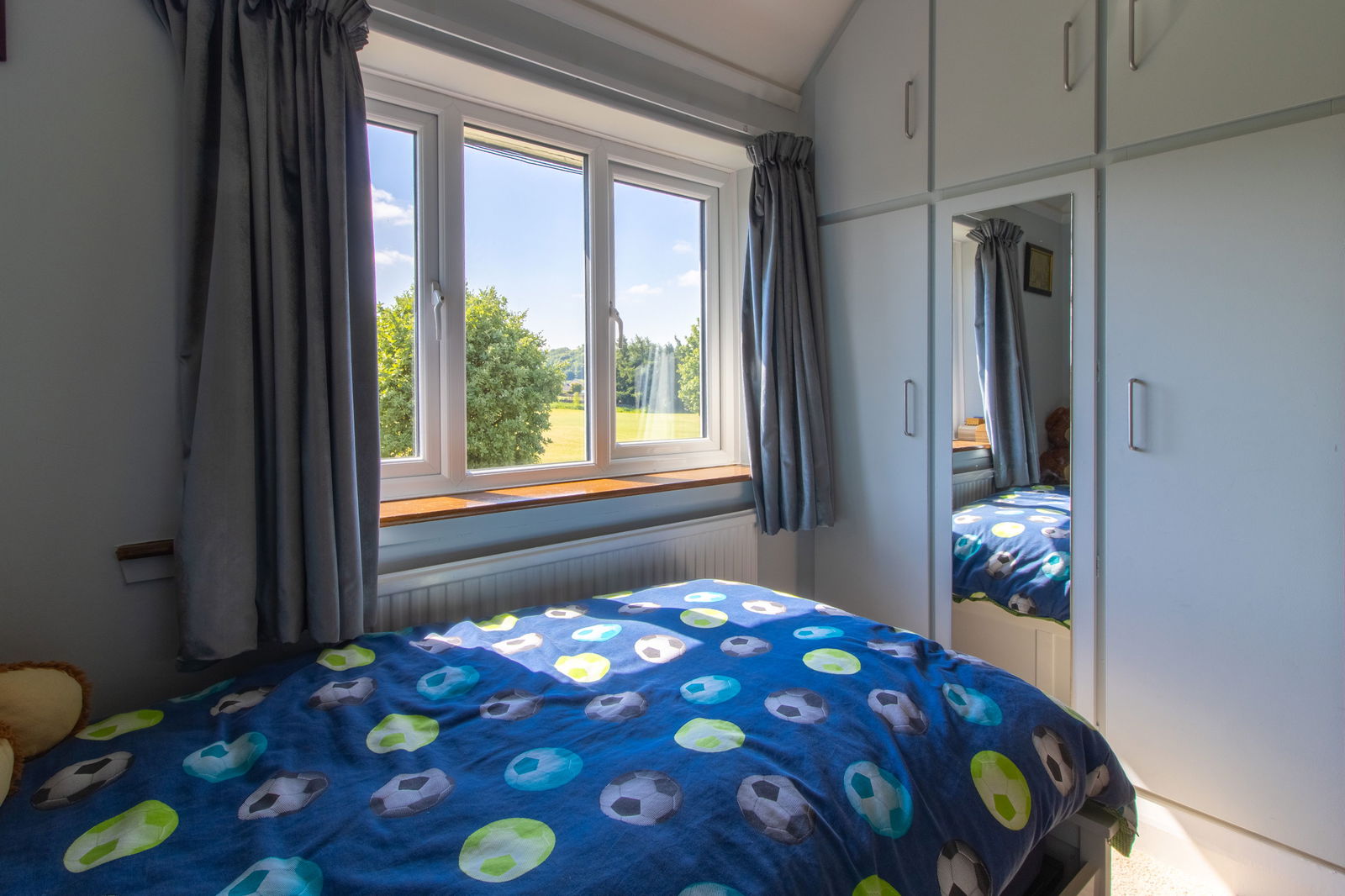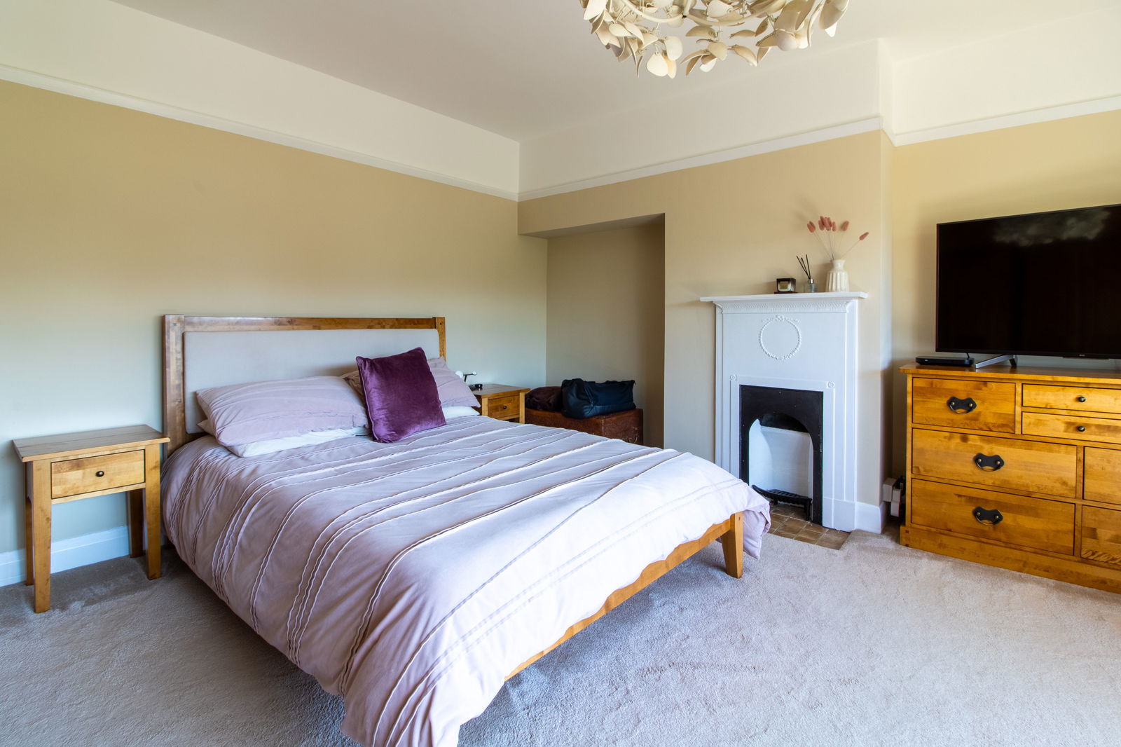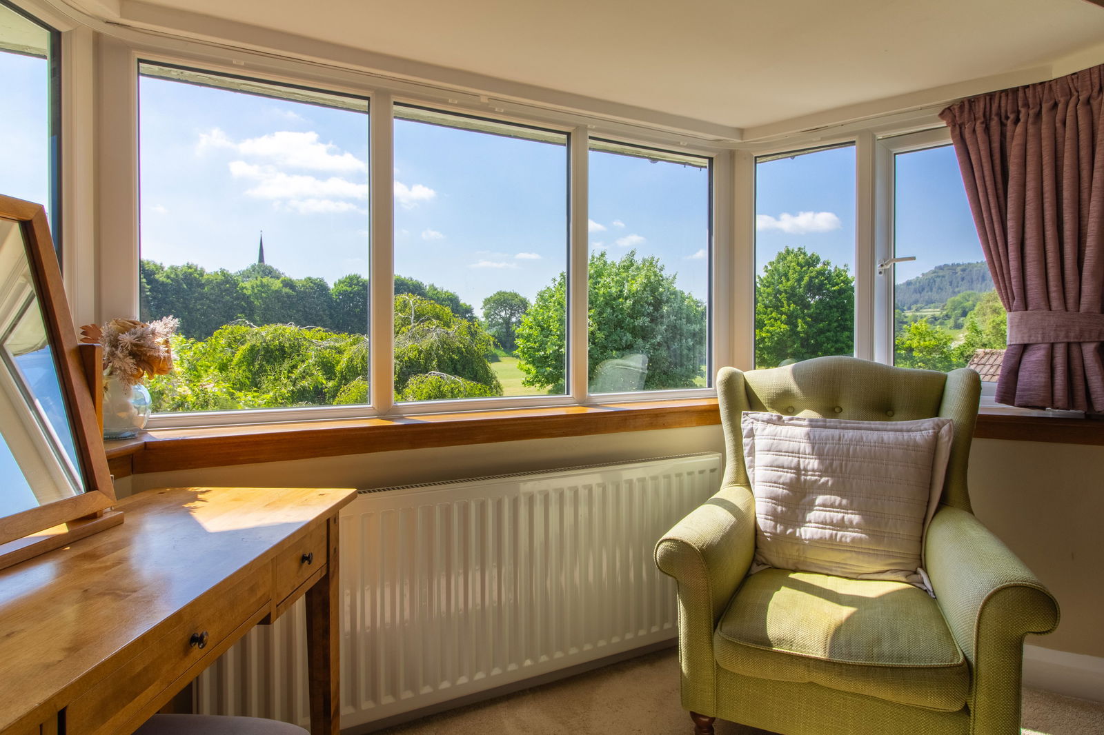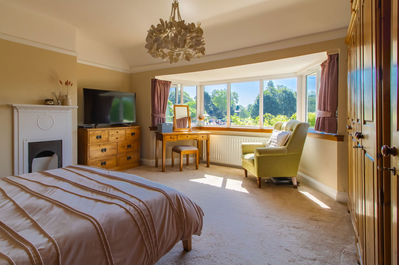 Principal Bedroom – A standout feature with a walk-in bay window offering views of Ashover’s historic church spire, original fireplace, and fitted shelving.