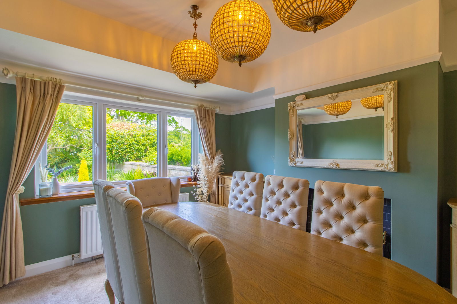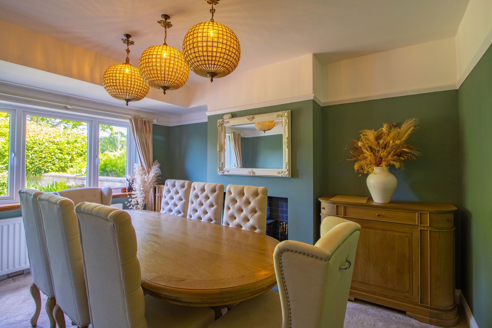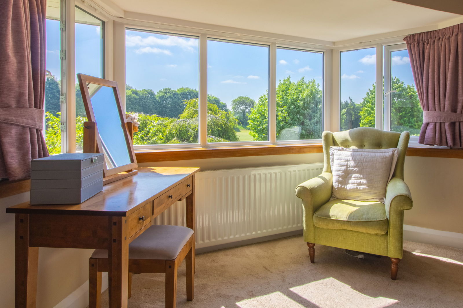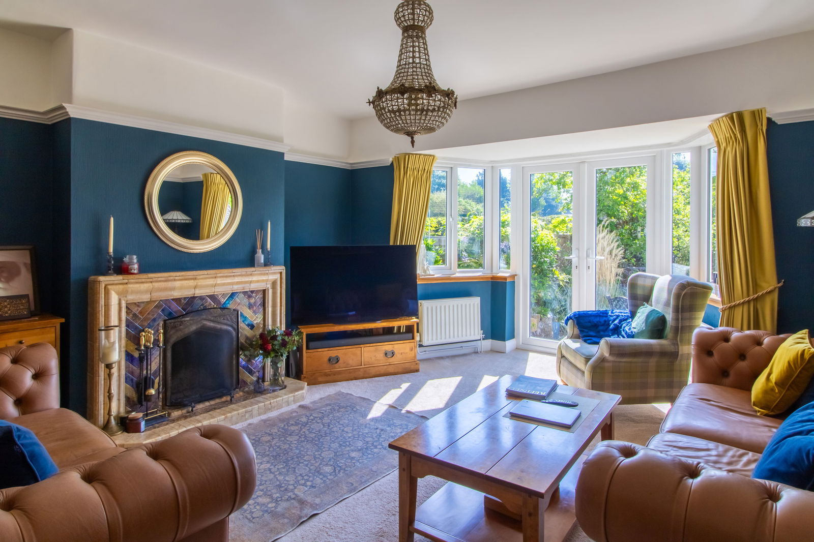 Charming Lounge – South-facing with French doors set into a bay, an open Art Deco fireplace, and countryside views.