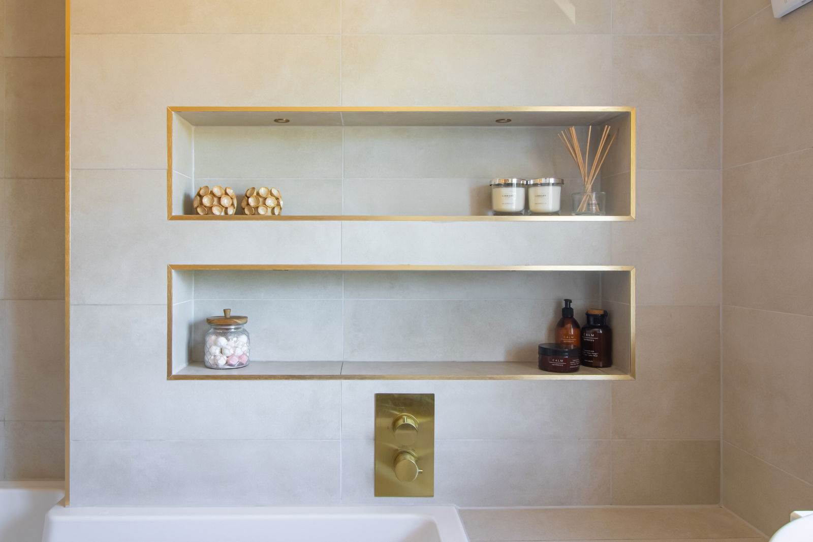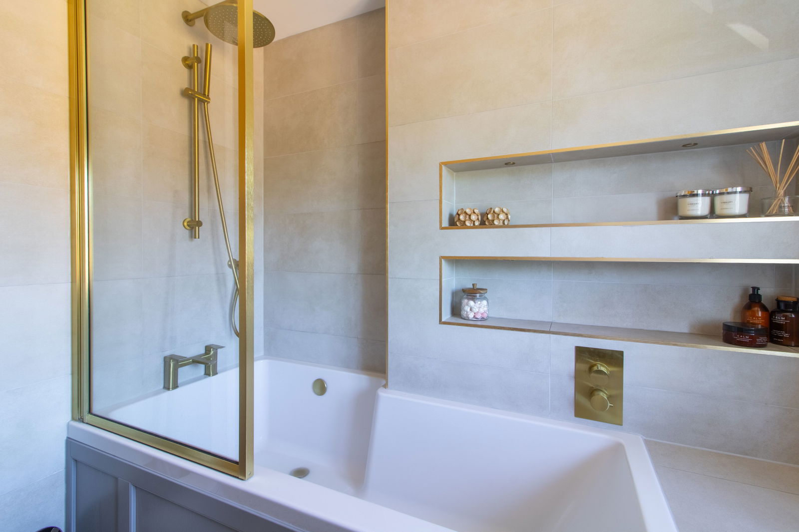 Stylish Three-Piece Family Bathroom – Including a bath with power shower and chrome towel rail.
