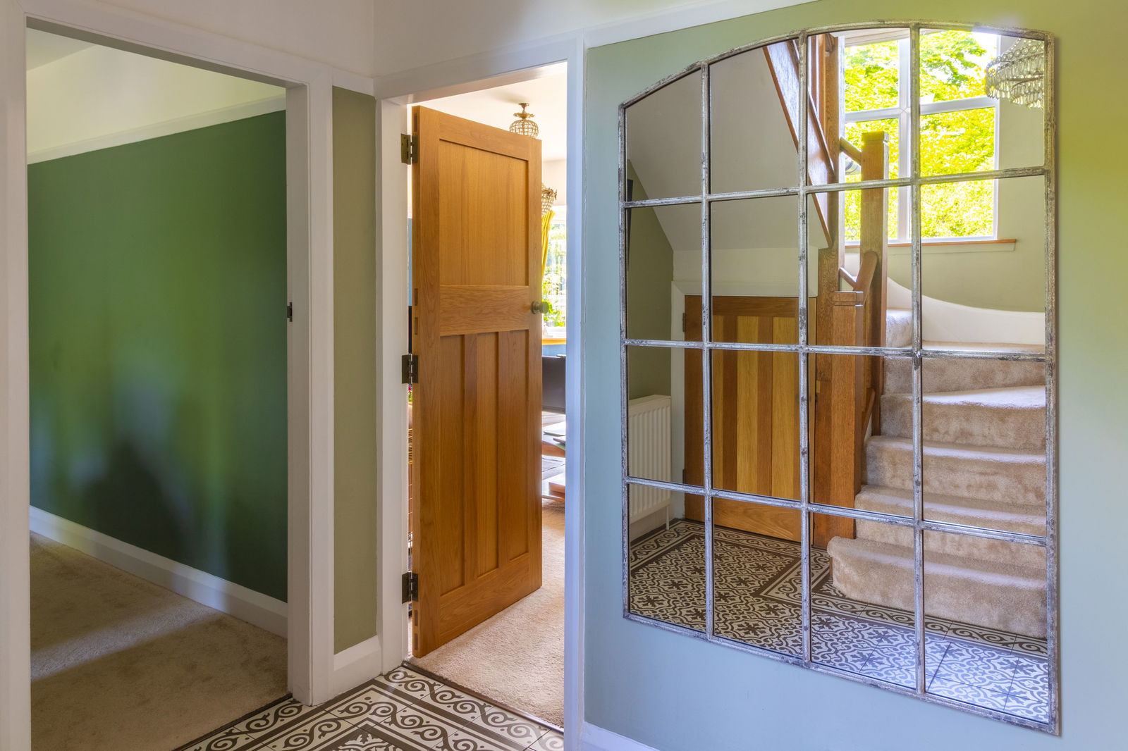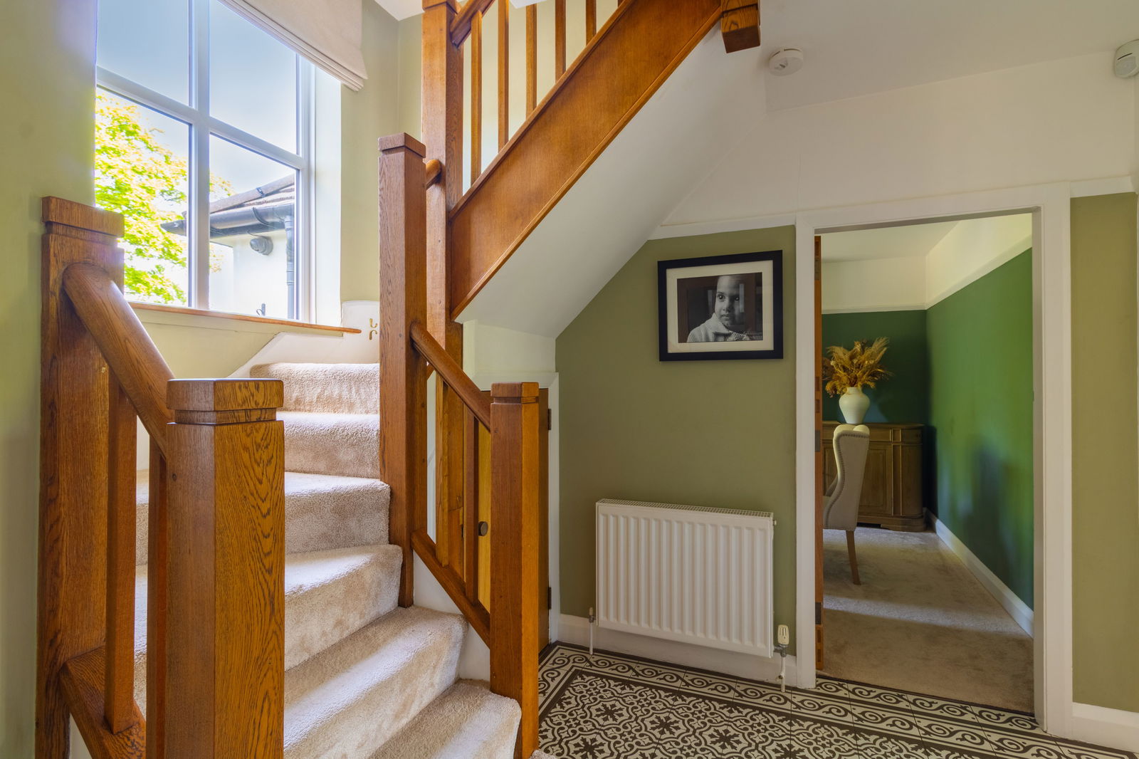 Elegant Hallway with amazing oak staircase and large picture window drawing in natural light.