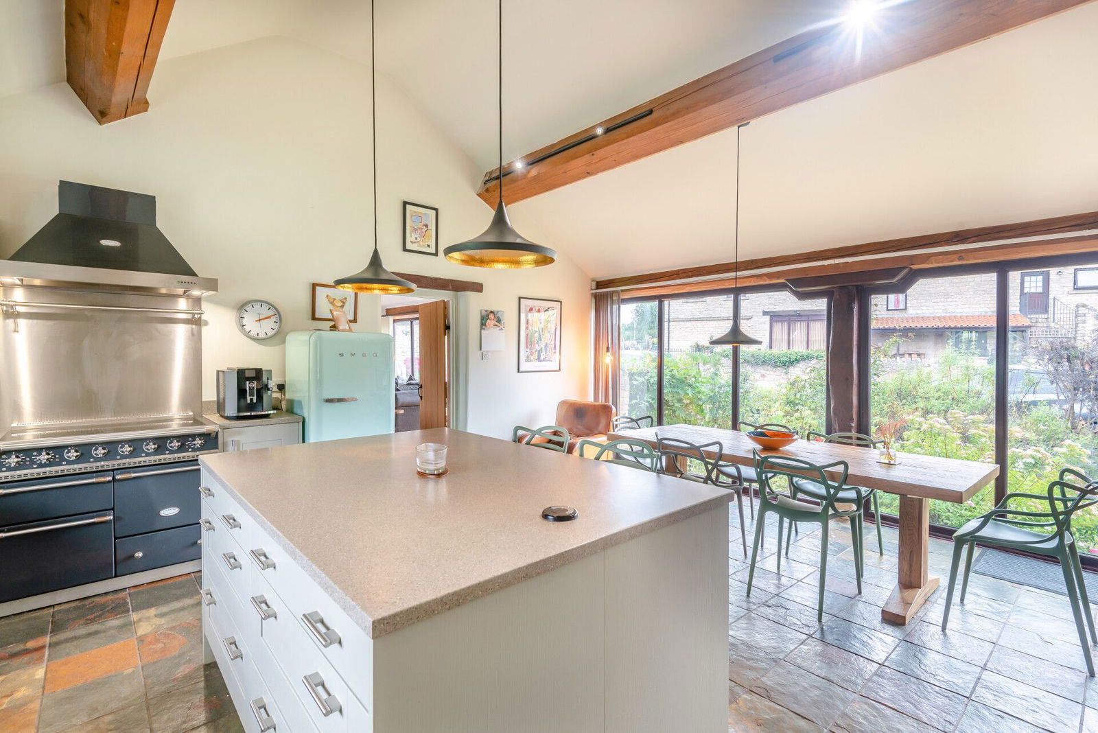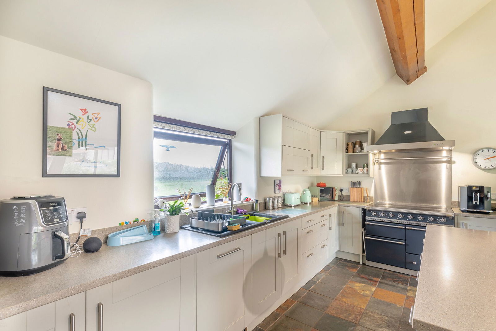 The living kitchen forms the central hub of the home, a spacious room offering sociable accommodation with a bank of full height windows to the front elevation, a ceiling exposed into the apex of the building with original exposed beams on display. There is a slate tiled floor, a feature rustic brick chimney breast has been converted to incorporate a useful storage cupboard whilst a comprehensive range of furniture is complemented by Corian worksurfaces which incorporates a sink unit positioned directly in front of a window overlooking the delightful rear grounds. A central island has a Corian surface extending to a breakfast bar whilst benefiting from draw units beneath. A complement of appliances includes a dishwasher and a fridge freezer whilst space for a double oven / stove is home to a Lacanche stove (to be dealt with by separate negotiation) which consists of a double oven and grill with a 5-ring electric hob and a stainless-steel splashback with matching extractor canopy over.